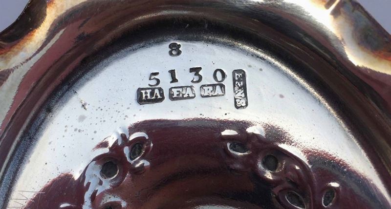 Vaschetta in sheffield completamente sbalzata a mano con decori floreali