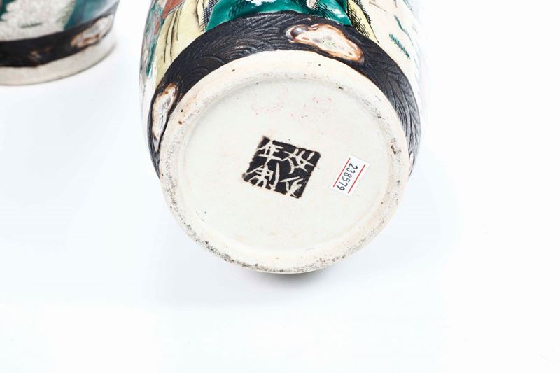 Coppia di vasi in porcellana raffiguranti paesaggi con cavalieri e figure di draghetti e leoncini a rilievo, Cina, Dinastia [..]