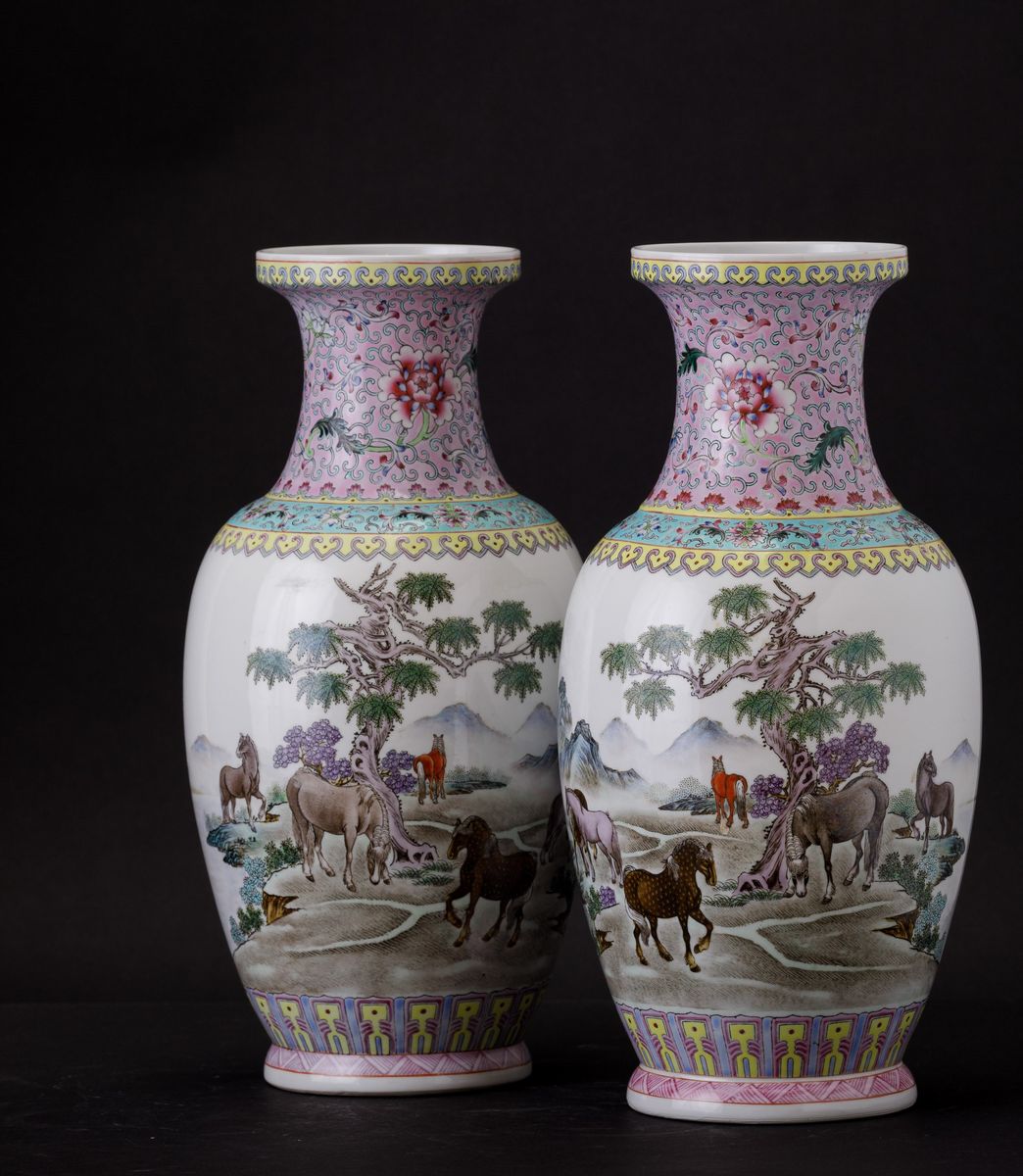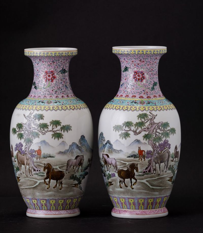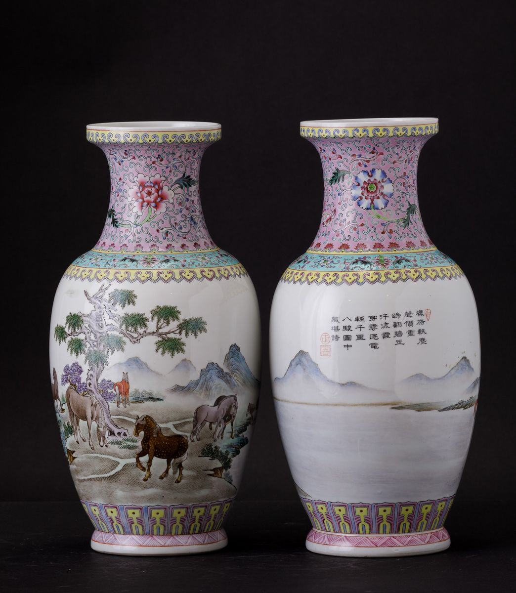 Coppia di vasi in porcellana raffiguranti paesaggi con cavalli, decori floreali e iscrizioni, Cina, XX secolo