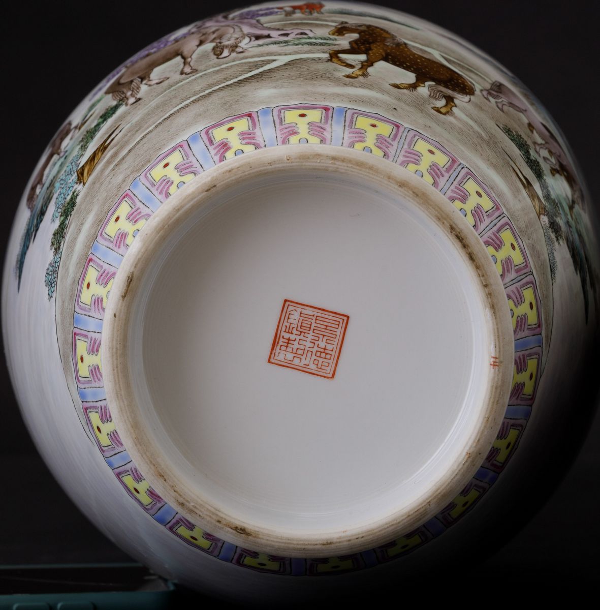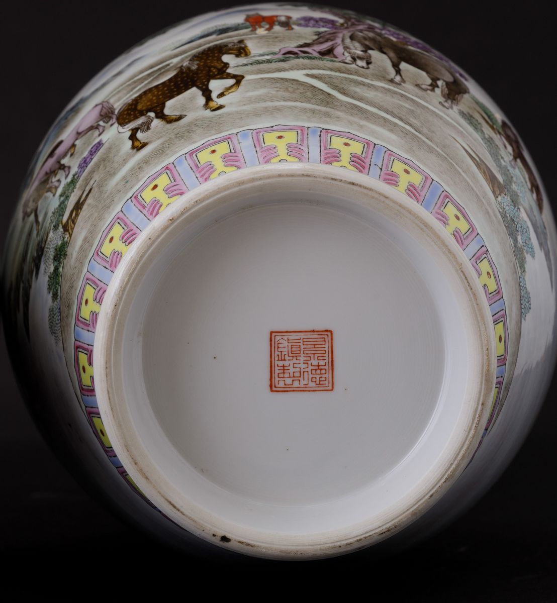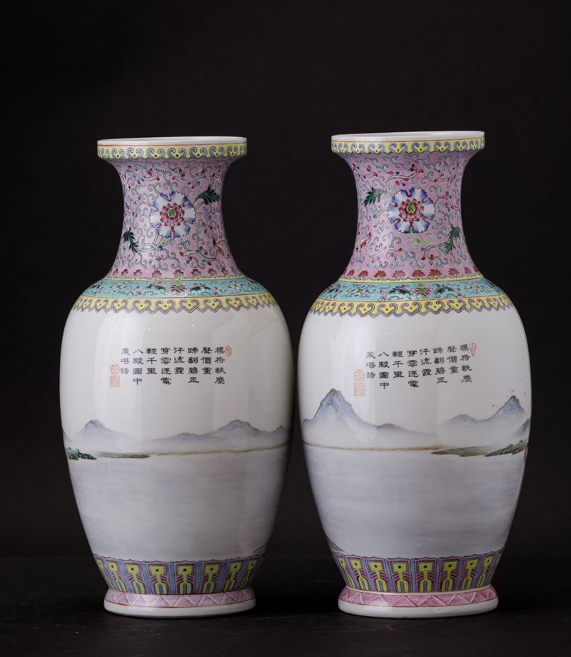 Coppia di vasi in porcellana raffiguranti paesaggi con cavalli, decori floreali e iscrizioni, Cina, XX secolo