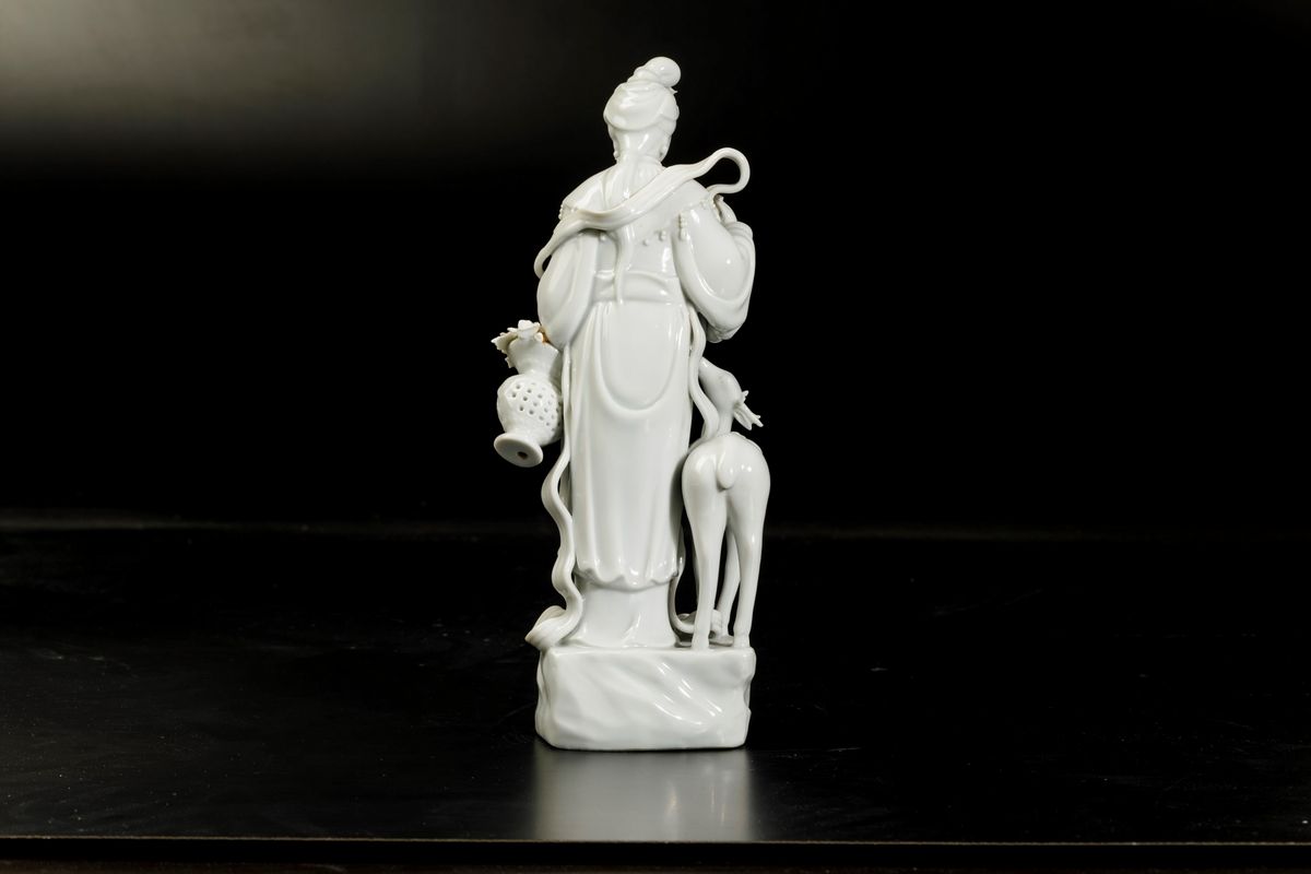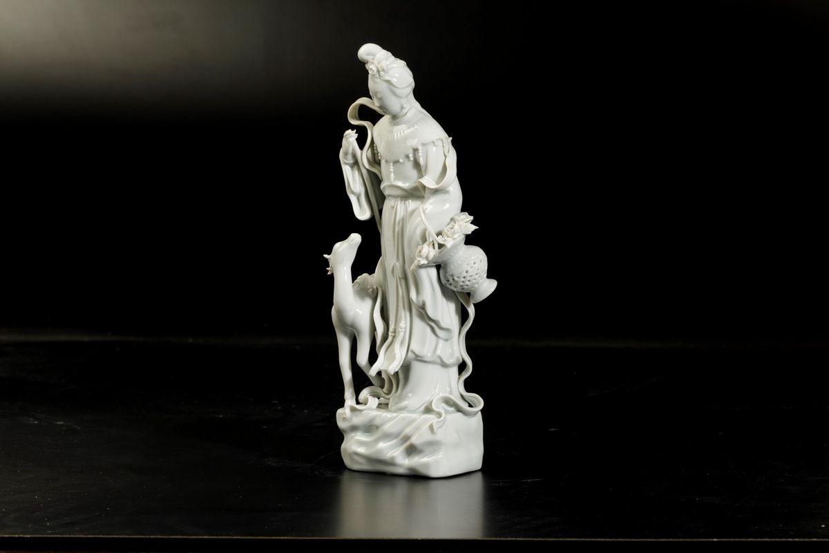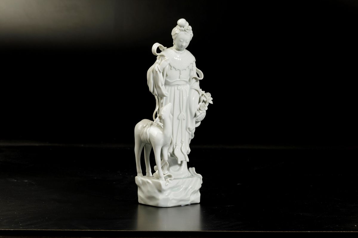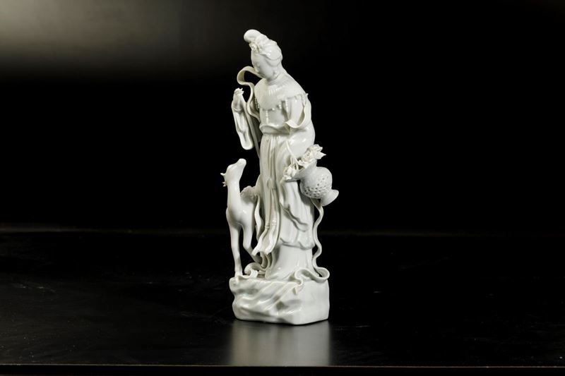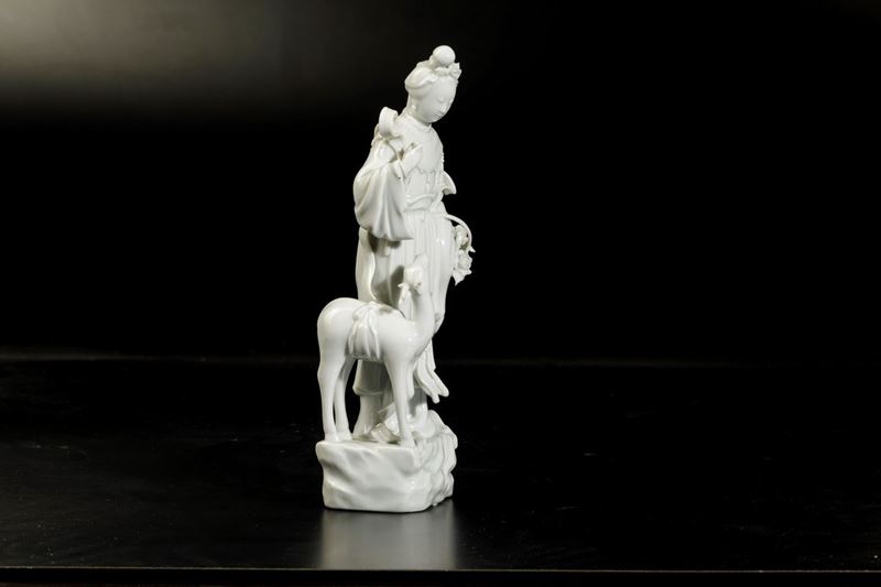 Figura di fanciulla con cerbiatto in porcellana Blanc de Chine, Cina, XX secolo