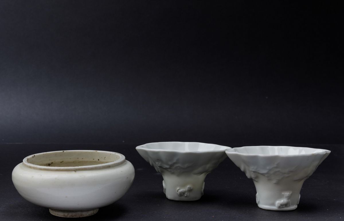 Lotto composto da due coppe da libagione e uno sciacquapennelli in porcellana Blanc de Chine, Cina, Dinastia Qing, XIX secolo