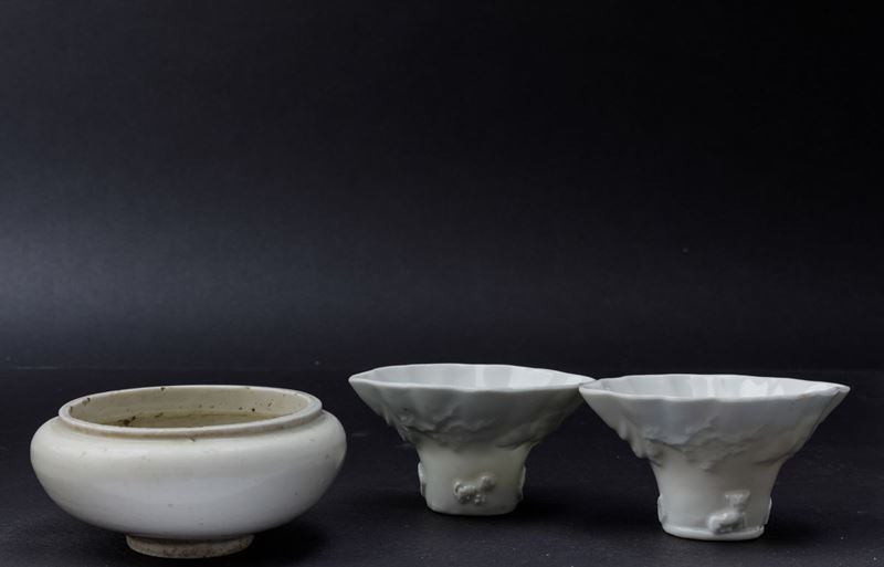Lotto composto da due coppe da libagione e uno sciacquapennelli in porcellana Blanc de Chine, Cina, Dinastia Qing, XIX se [..]