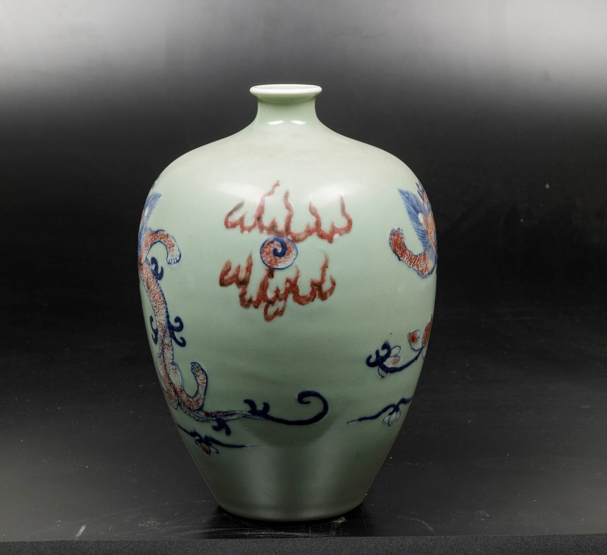 Lotto composto da vaso con coperchio in bronzo e due vasi in porcellana a smalti policromi, Cina, Dinastia Qing, XIX-XX secolo