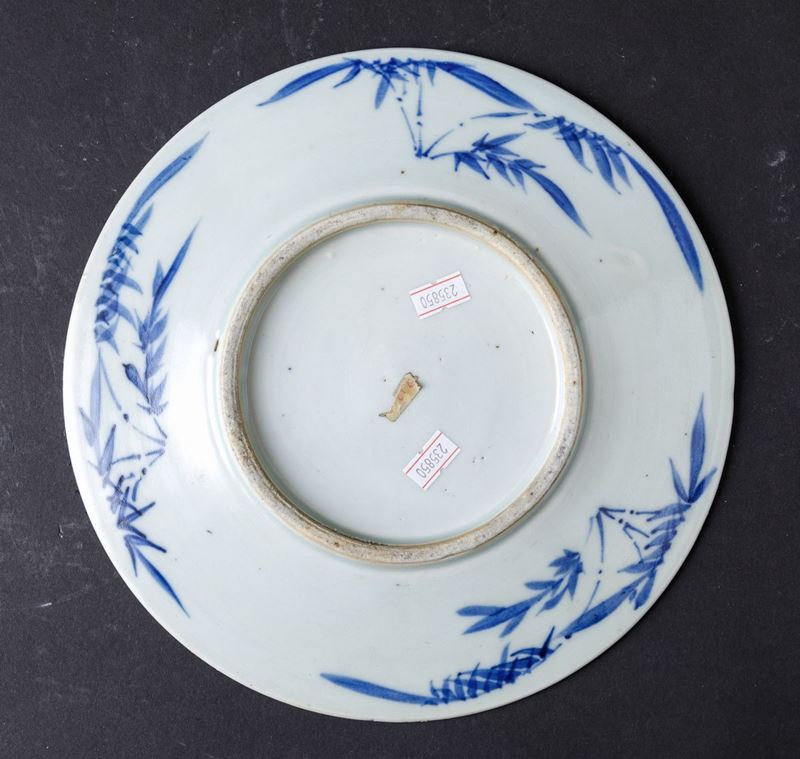 Piatto in porcellana bianca e blu con decori floreali e uccellino tra i rami, Cina, Dinastia Qing, XIX secolo