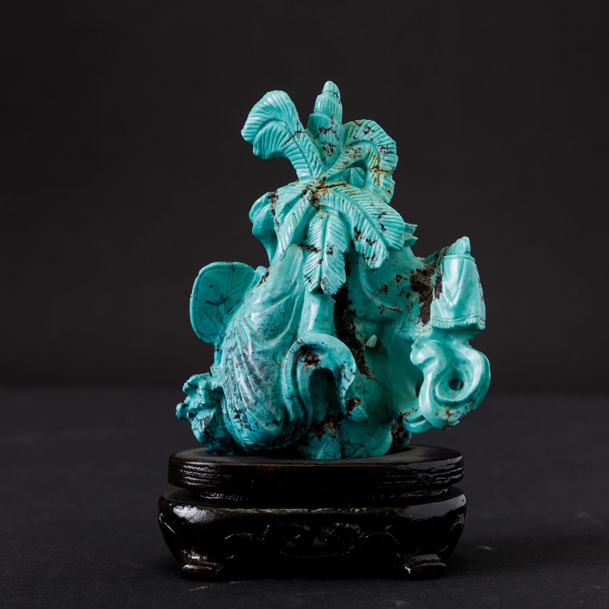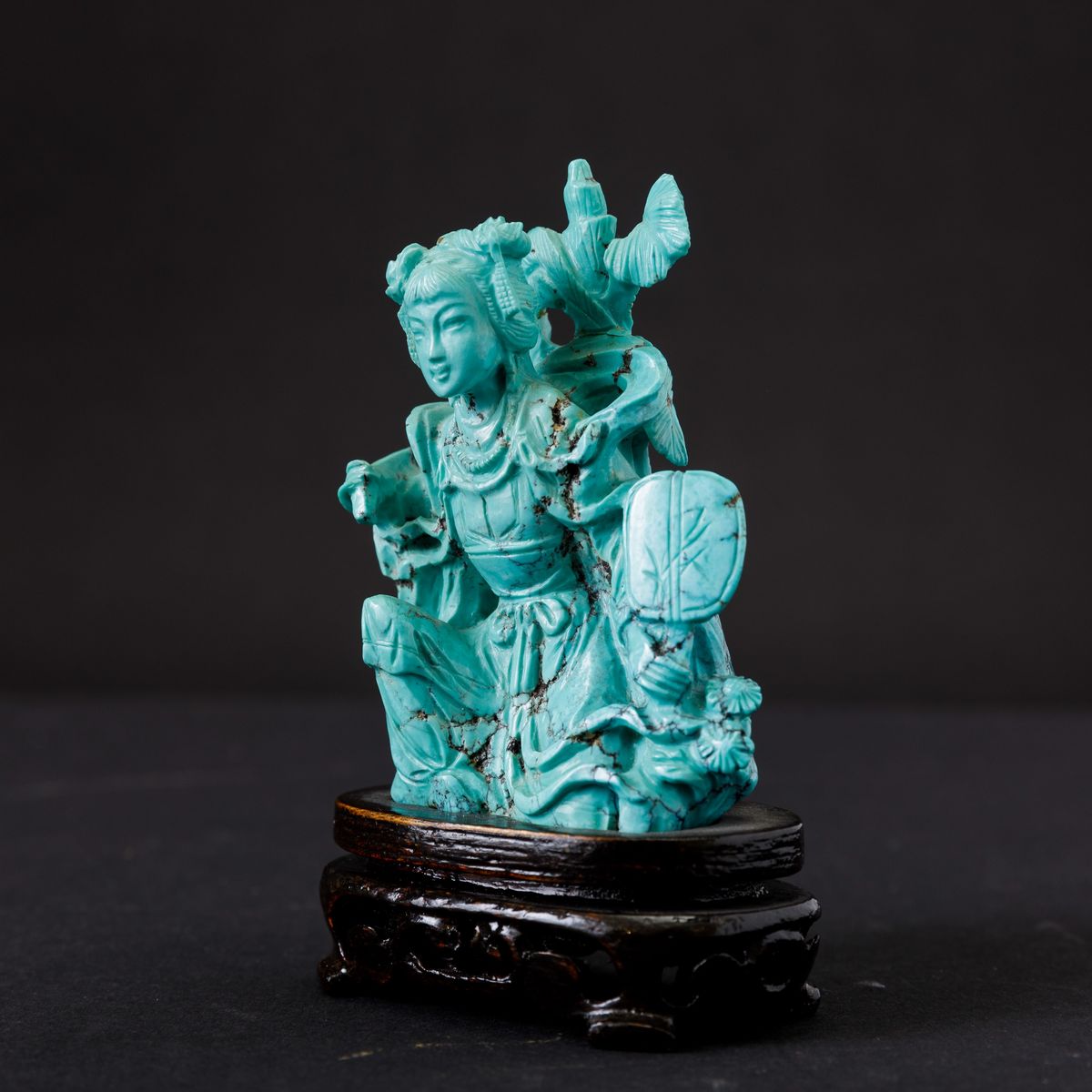 Piccola figura di fanciulla con scroll e ventaglio scolpita in turchese, Cina, Dinastia Qing, XIX secolo
