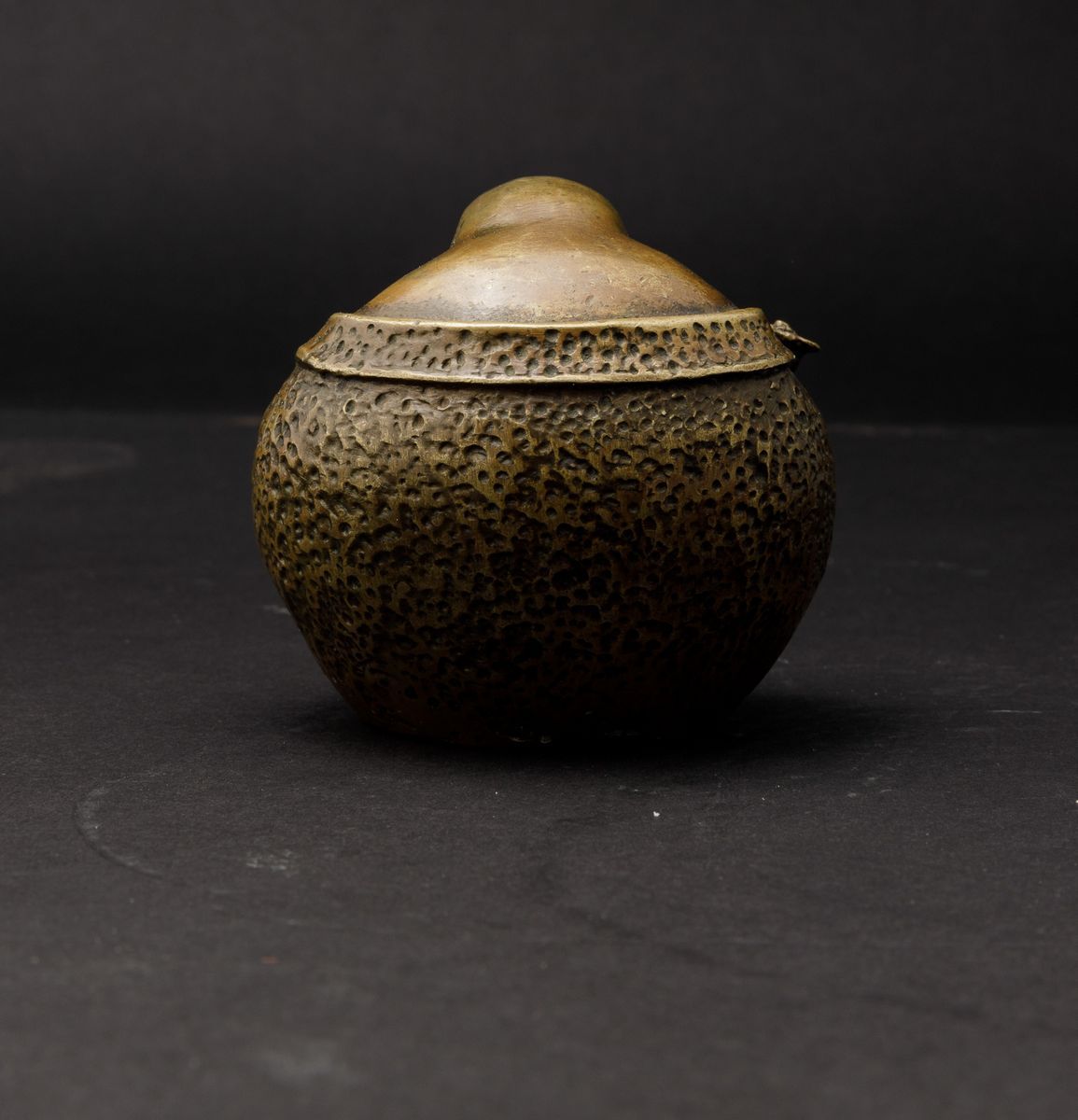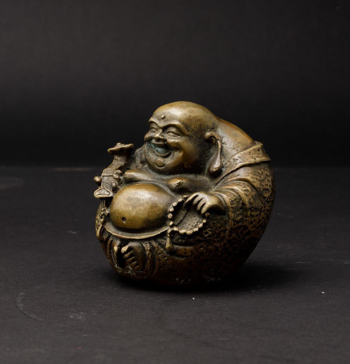 Piccola figura in bronzo raffigurante Budai seduto con Ruyi e collana da preghiera, Cina, XX secolo