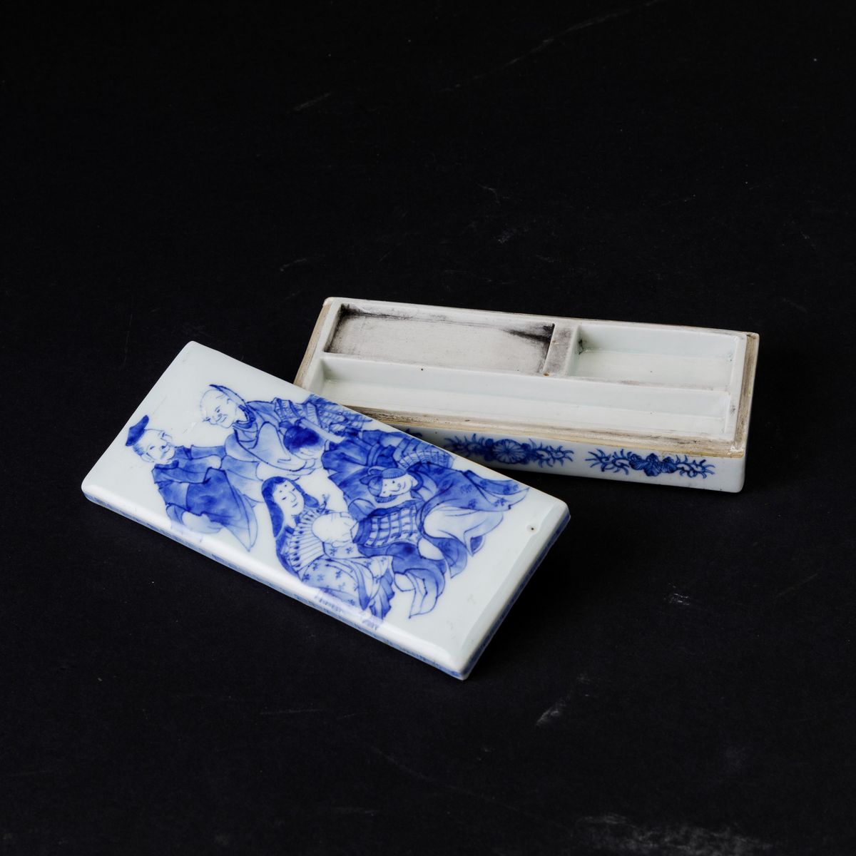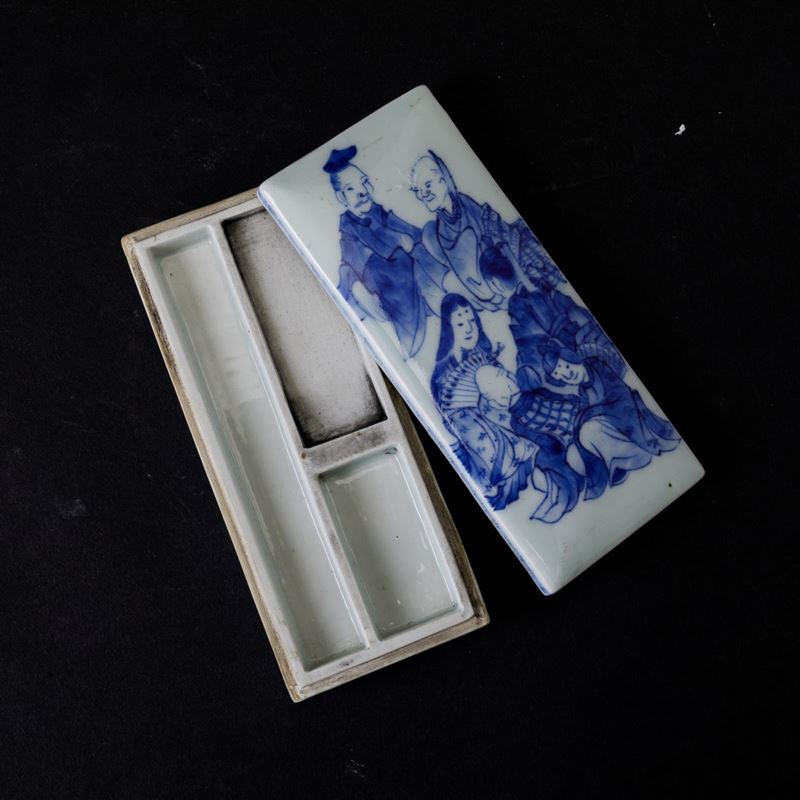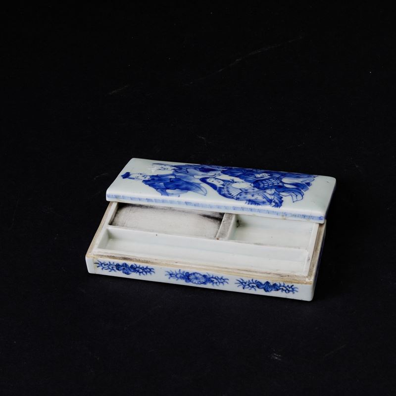 Scatola in porcellana bianca e blu con figure di saggi, Cina, Dinastia Qing, epoca Qianlong (1736-1796)