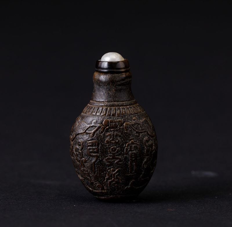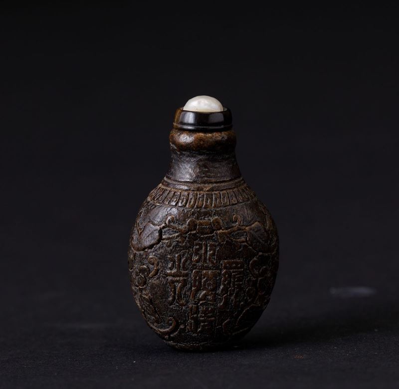 Snuff bottle in cocco con decori incisi e a rilievo, Cina, Dinastia Qing, XIX secolo