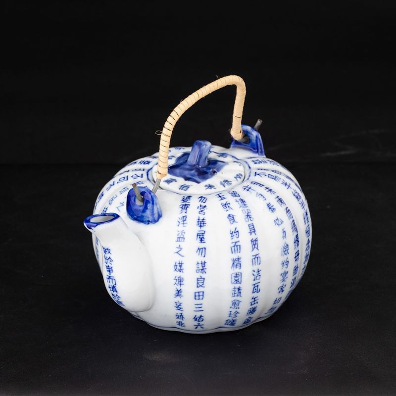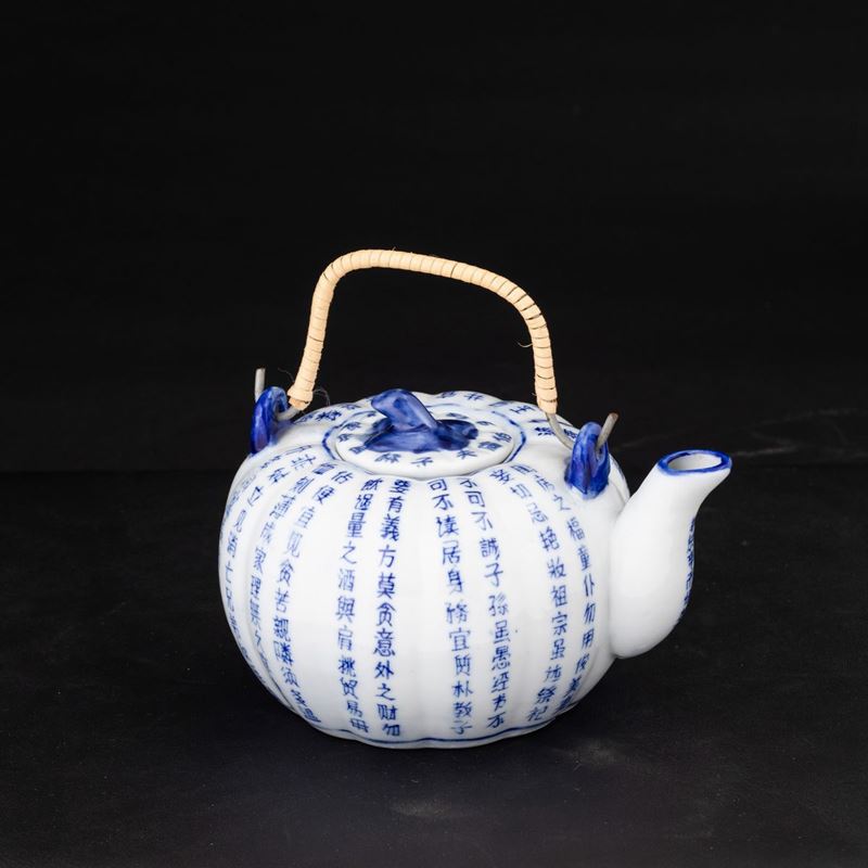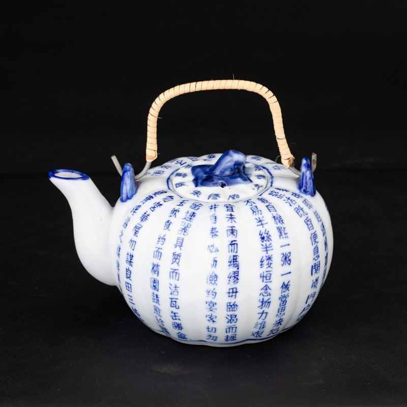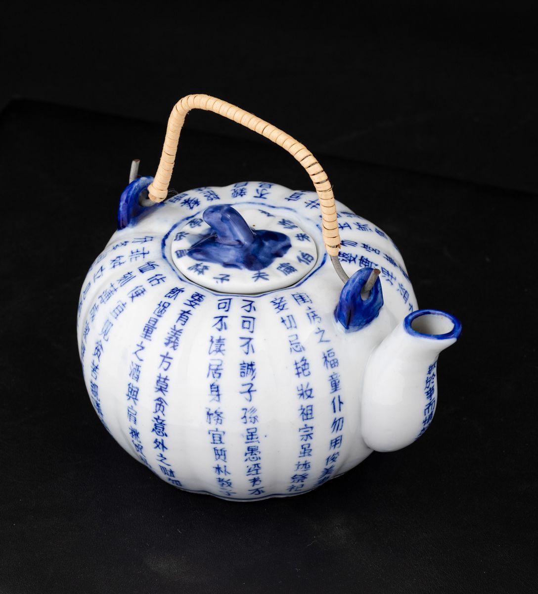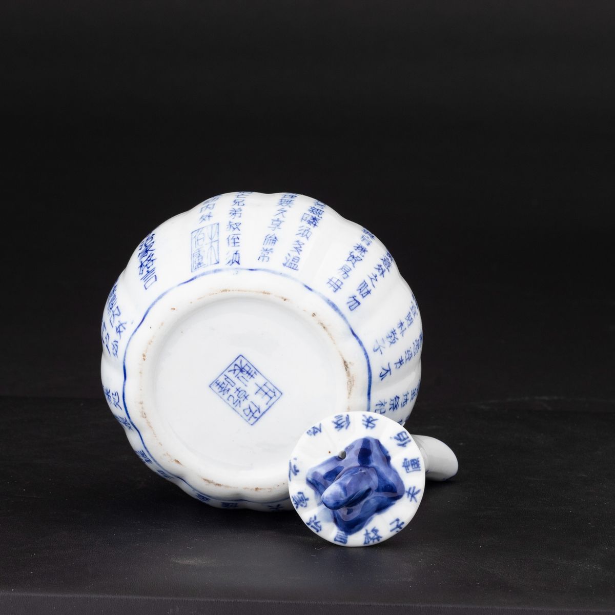Teiera a foggia di zucca in porcellana bianca e blu con iscrizioni, Cina, Dinastia Qing, XIX secolo