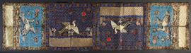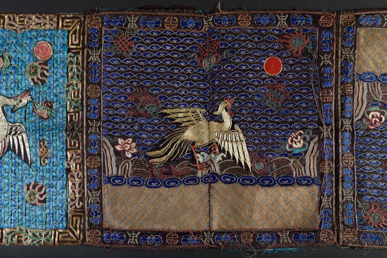 Tessuto in seta ricamata a fondo blu e azzurro con figure di aironi, Cina, Dinastia Qing, XVIII secolo