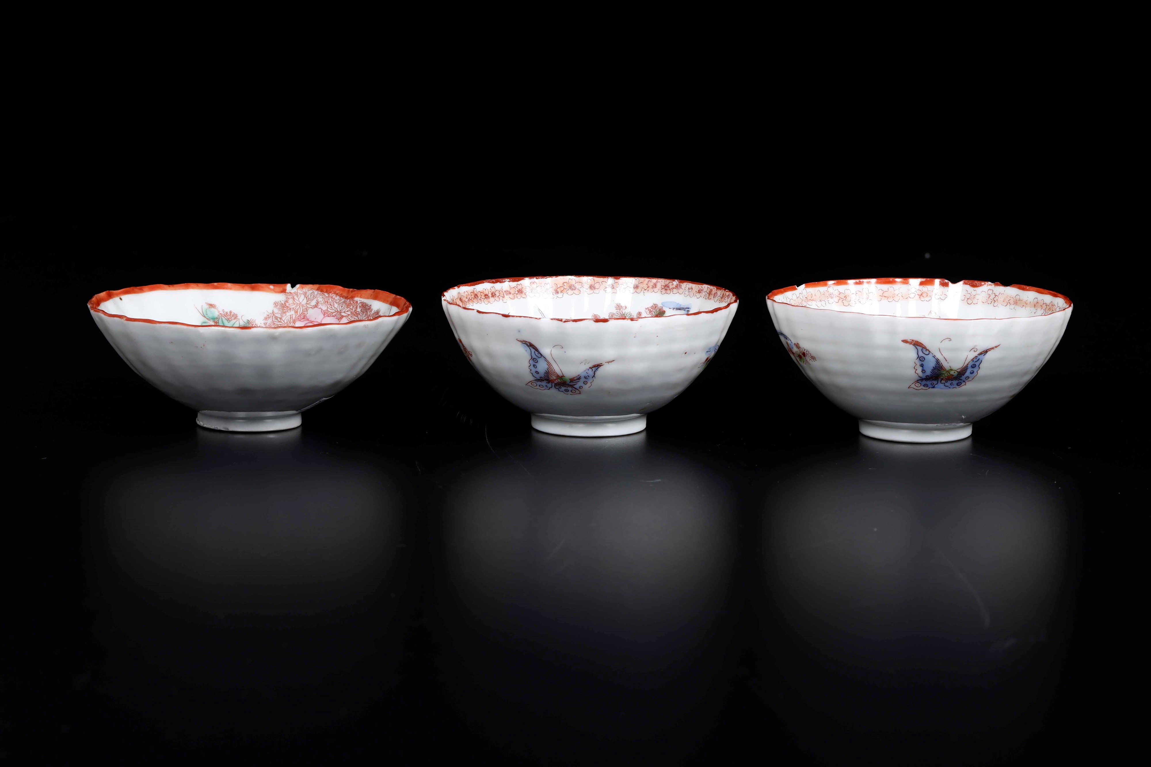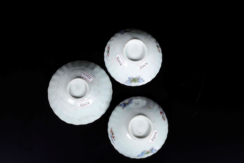 Tre piccole ciotole in porcellana con decoro di farfalle e uccellini tra i rami, Cina, Dinastia Qing, XIX secolo