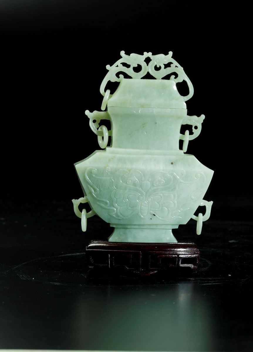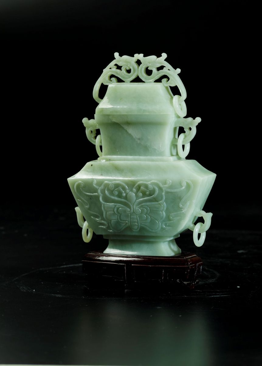 Vaso con coperchio scolpito in giada con anse ad anello e figure di farfalle, Cina, Dinastia Qing, XIX secolo
