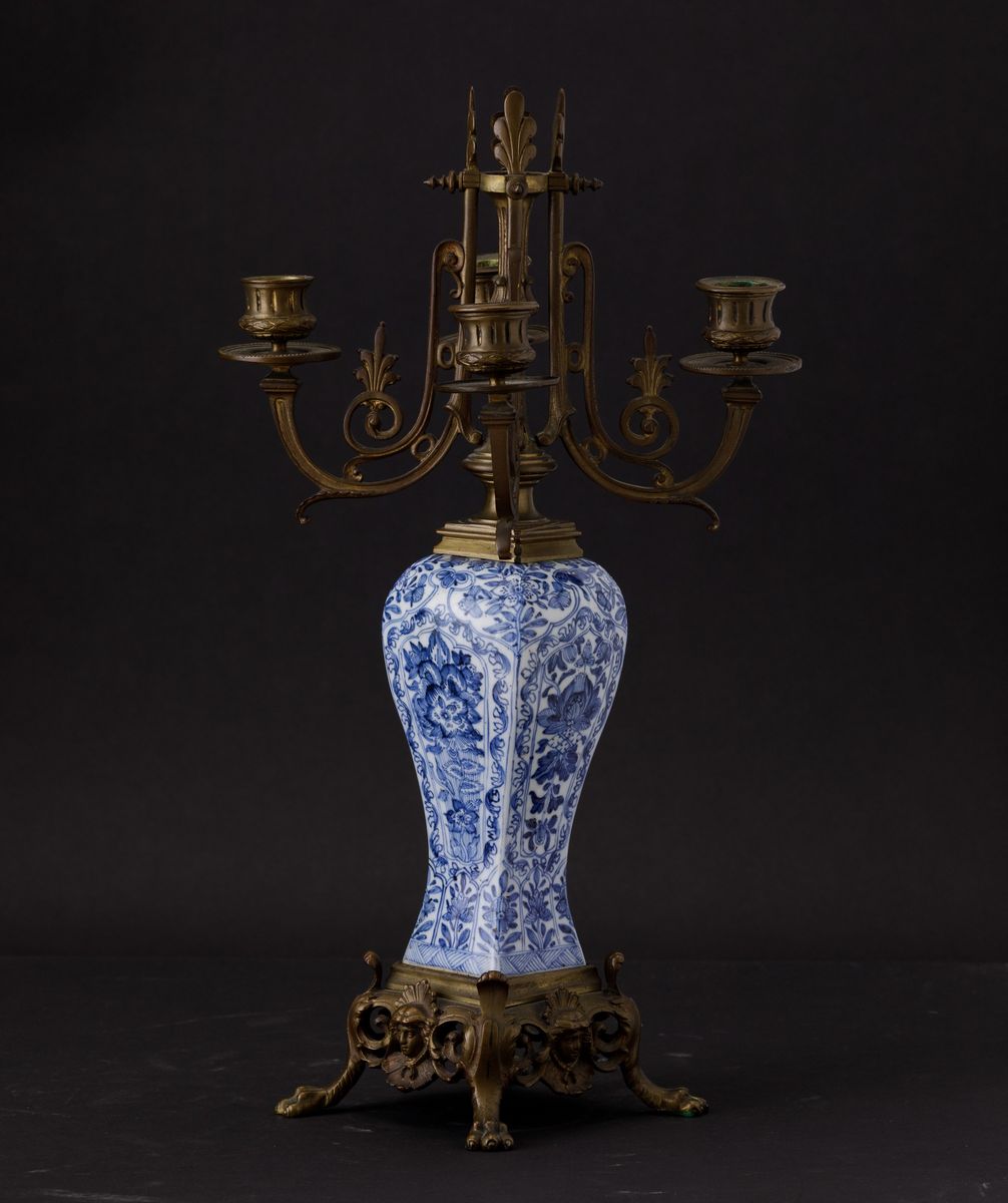 Vaso in porcellana bianca e blu con decori floreali entro riserve su montatura in bronzo dorato, Cina, Dinastia Qing, epoca Kangxi (1662-1722)