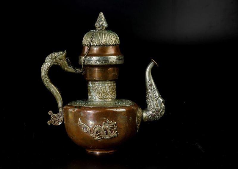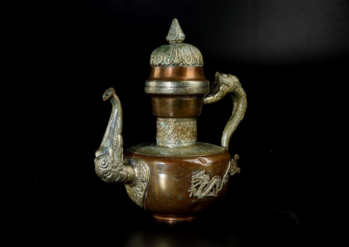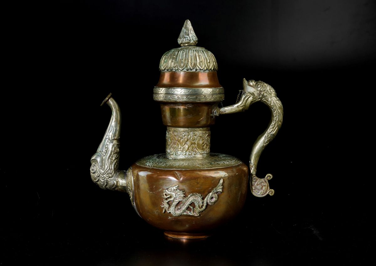 Versatoio in metallo sbalzato e cesellato con figure di draghi, Tibet, XIX secolo