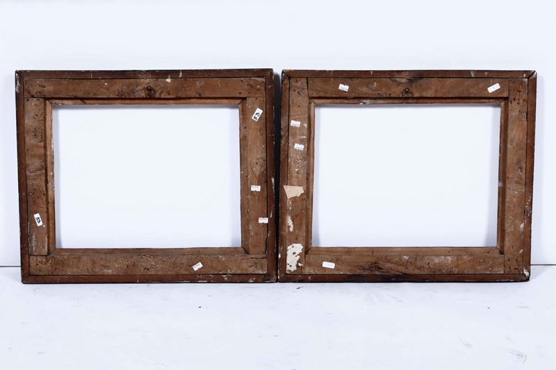 Coppia di cornici in legno ebanizzato a tre ordini di intagli dorati, Roma XVIII secolo