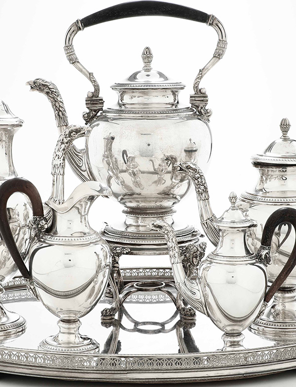 composto da samovar, vassoio a specchio, due caffettiere, teiera, lettiera. Beccucci a guisa di testa di aquila, manici in legno sagomato ed ebanizzato altezza cm 43,5 (con manico alzato) Rottura al manico del Samovar