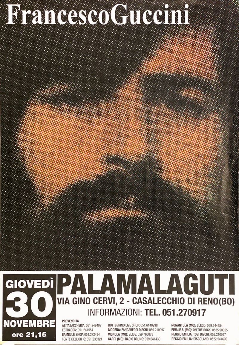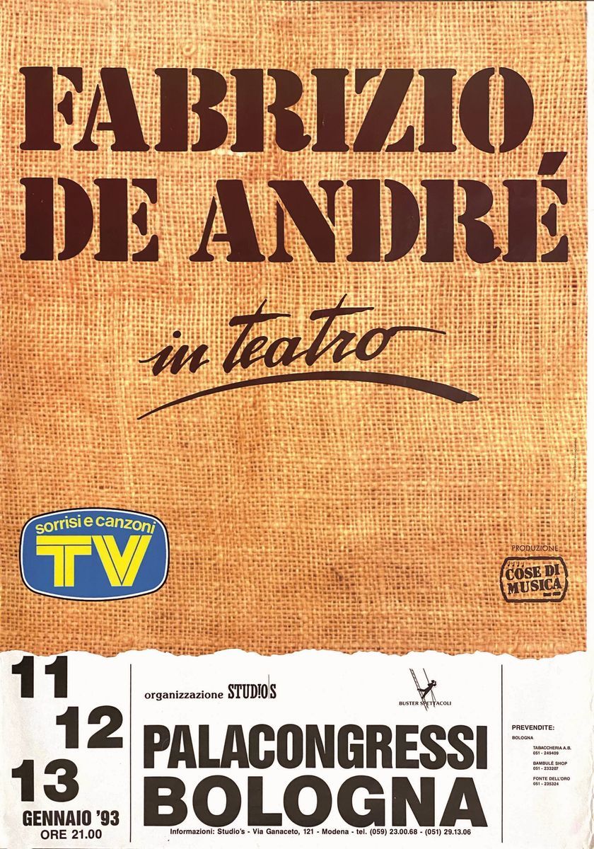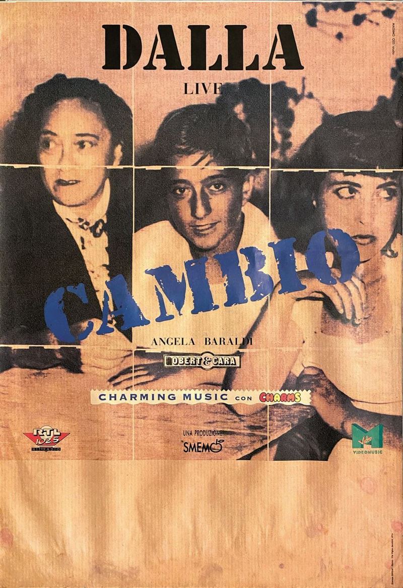 Lotto composto da 4 manifesti originali per concerti. Ciascuno cm 100x70. "Baglioni assieme sotto un cielo mago, estate 1992". Qualità A-: lievi stropicciature marginali. "Dalla Live Cambio", 1991. Qualità A-: piccole macchie marginali. "Fabrizio De Andrè in teatro", Bologna 1993. Qualità A-. "Francesco Guccini", 2006. Qualità A.