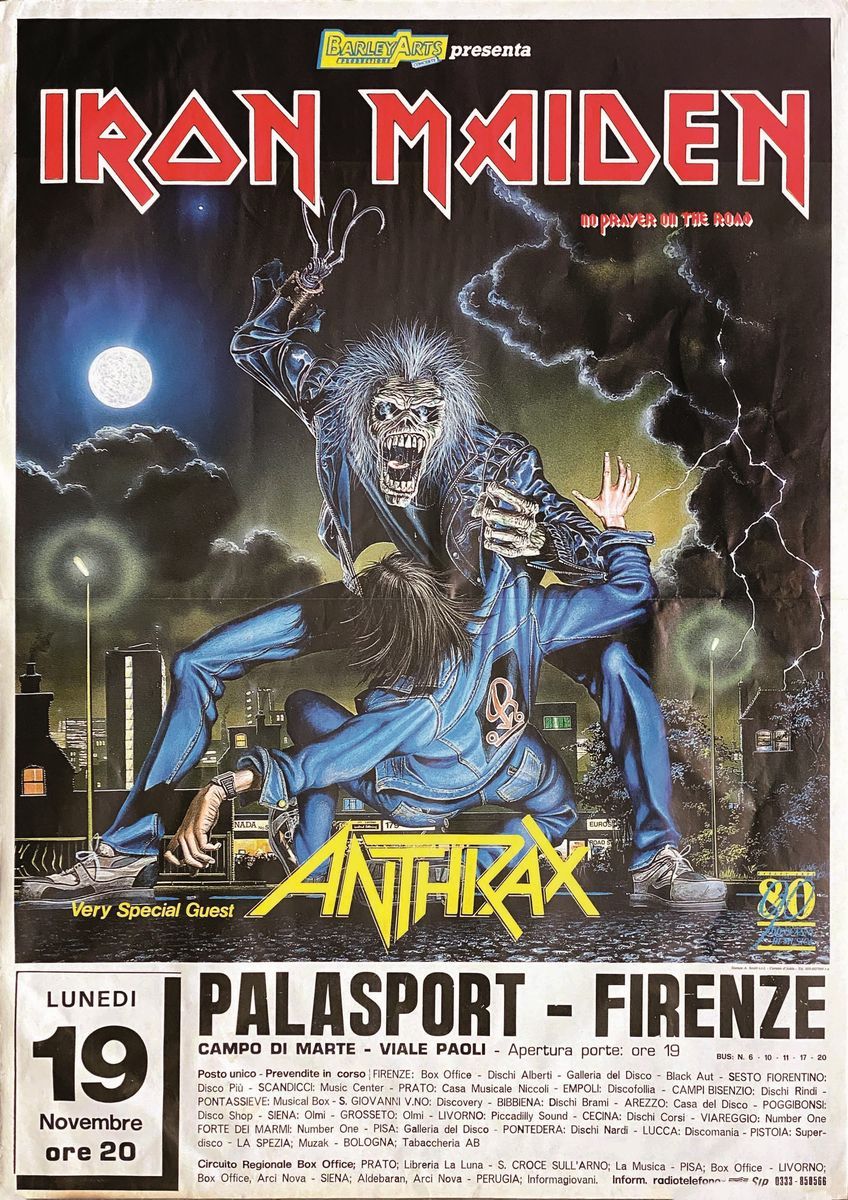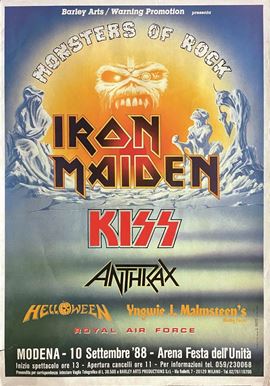 Coppia di manifesti originali per concerti. Ciascuno cm 100x70. "Iron Maiden Kiss Anthrax", Modena 1988. Qualità A-: strappetto senza mancanze al margine sinistro. "Iron maiden Anthrax Not prayer on the Road", 1990. Qualità A-: lievi stropicciature marginali.