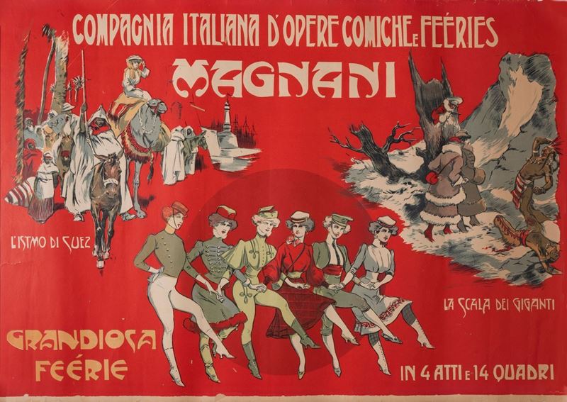 Affisso litografico originale. Fine secolo XIX. In due fogli per complessivi cm 140x100. Qualità B+: strappetti marginali con lievi mancanze.