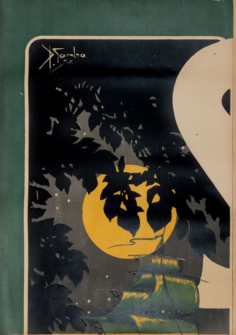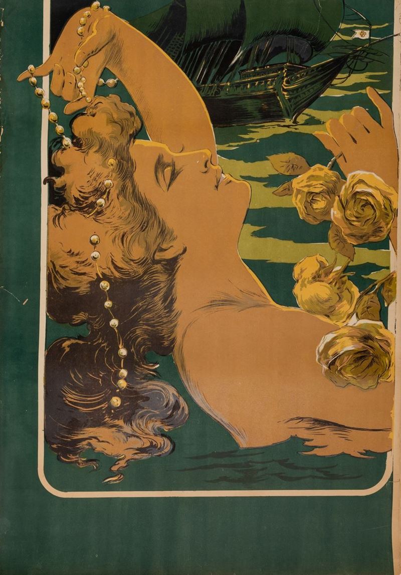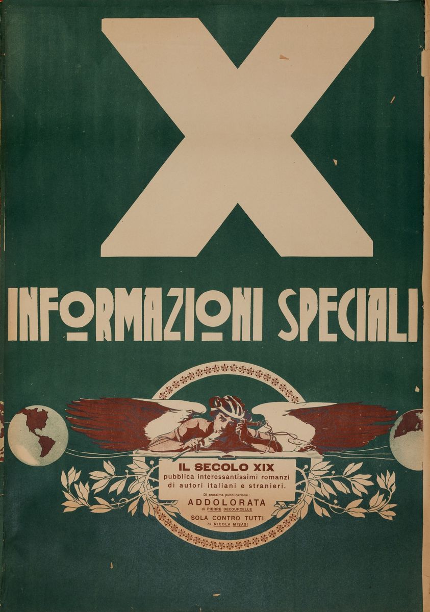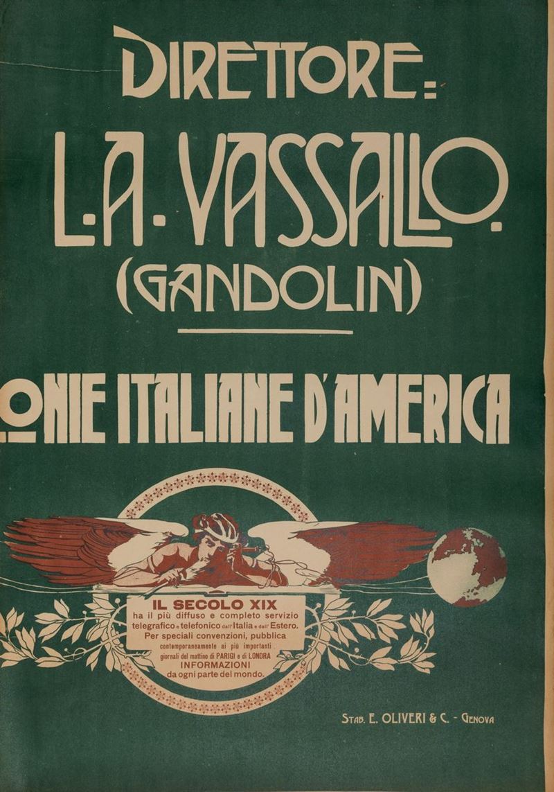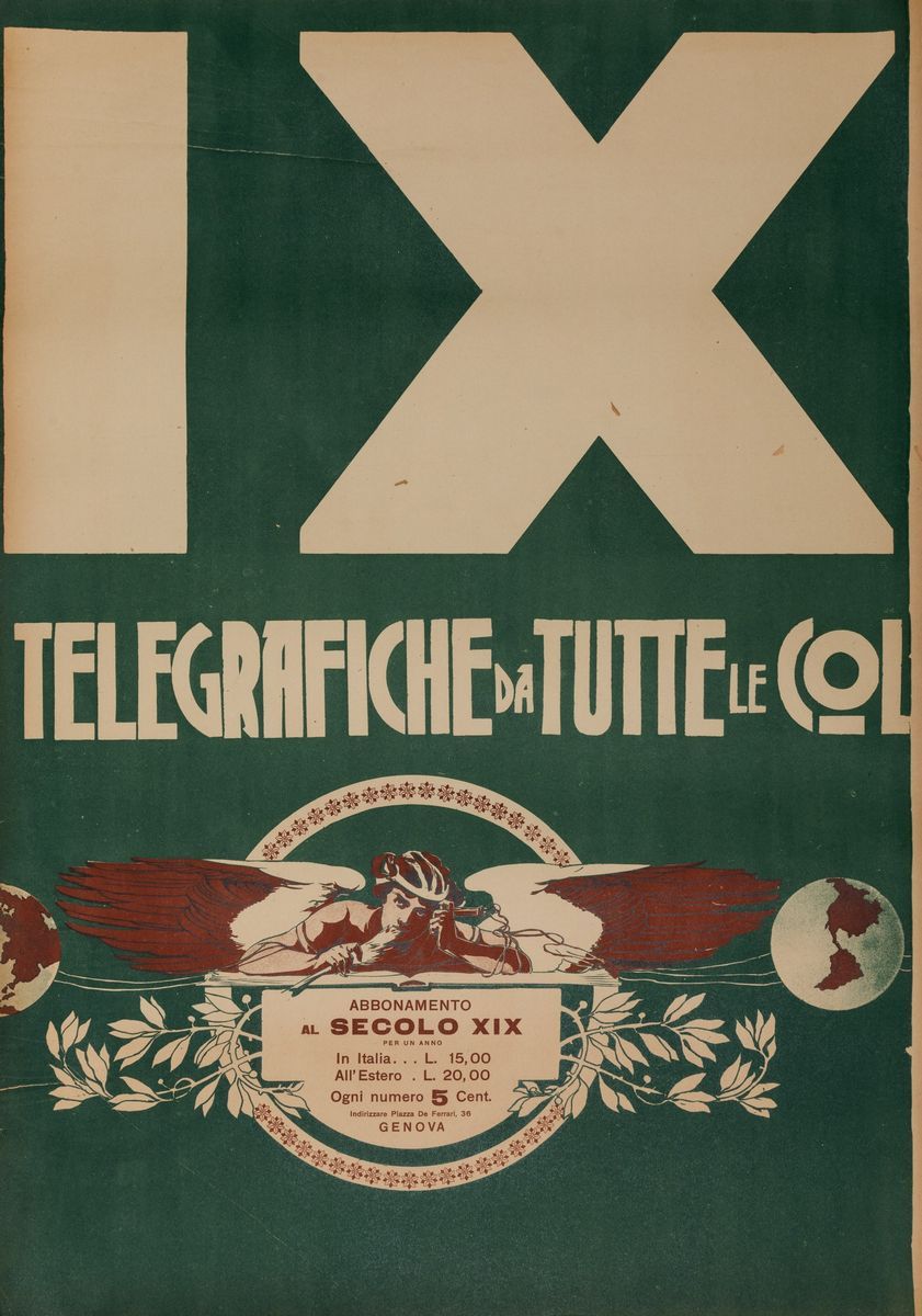 Affisso litografico in 8 fogli impresso da stabilimento Olivieri - Genova per il quotidiano diretto da L.A. Vassallo (Gandolini), 1906. Qualità A-. Strappetti lungo i margini, un foglio con lieve perdita marginale.