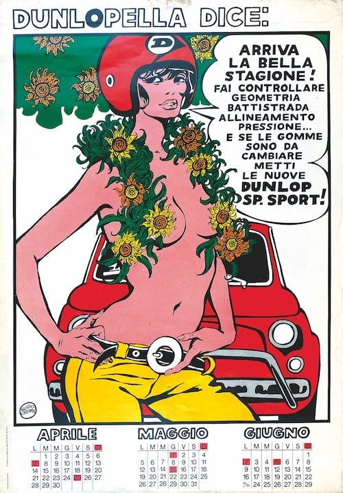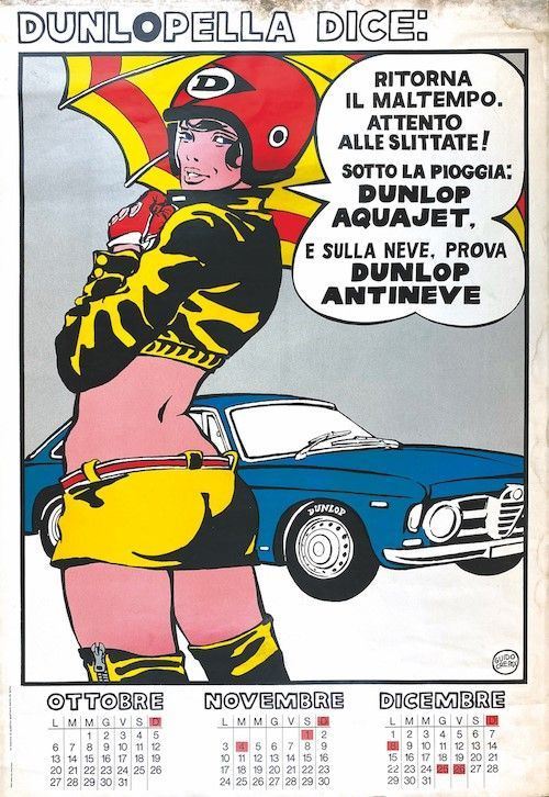 Calendario completo, non datato ma 1969. Composto da 4 plance, ciascuna cm 69,5x48. Il personaggio realizzato per la Dunlop ricalcava le fattezze di Valentina. Collezione rara che appartiene al periodo più pop dell’artista. Lievi tracce di umidità al margine superiore e un piccolo strappetto alla tavola Luglio - Settembre.