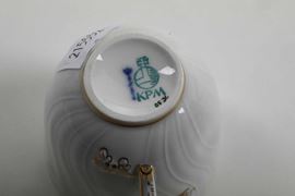 Porcellana. Marca: scettro in blu; globo con croce e "KPM" in verde. Altezza tazza cm 5,7; diametro piattino cm 11,1. Perfetto stato di conservazione
