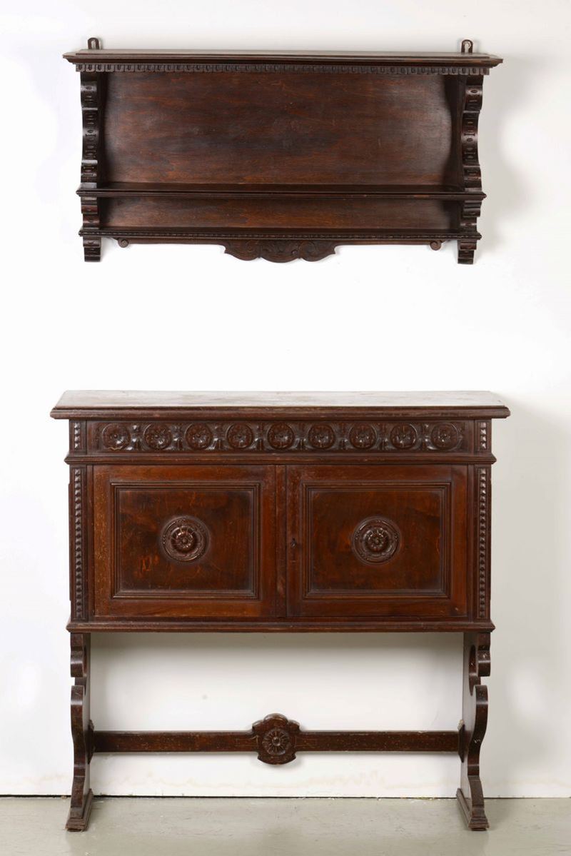 Mobile e mensola in legno intagliato in stile Rinascimento, XX secolo
