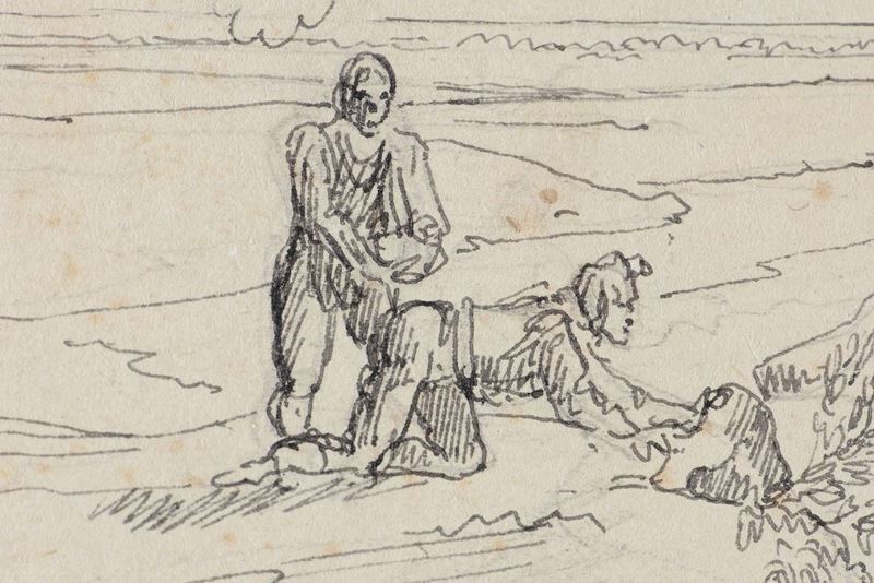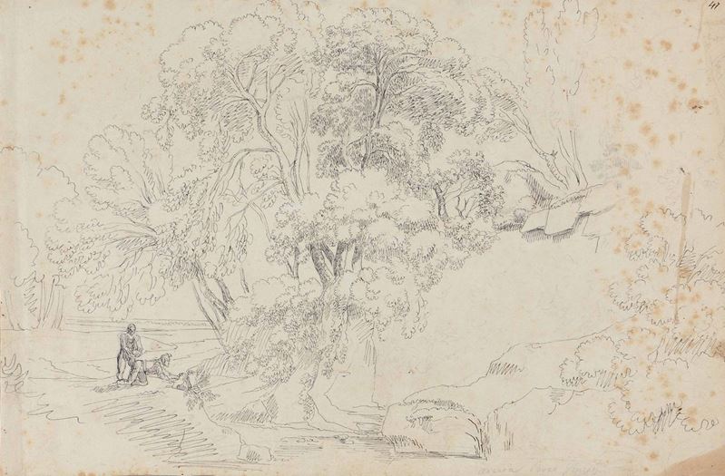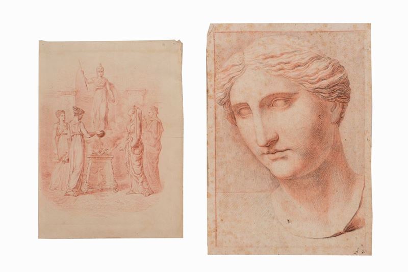 Scuola del XIX secolo Scena di sacrificio Testa dell'antico Paesaggio con figure