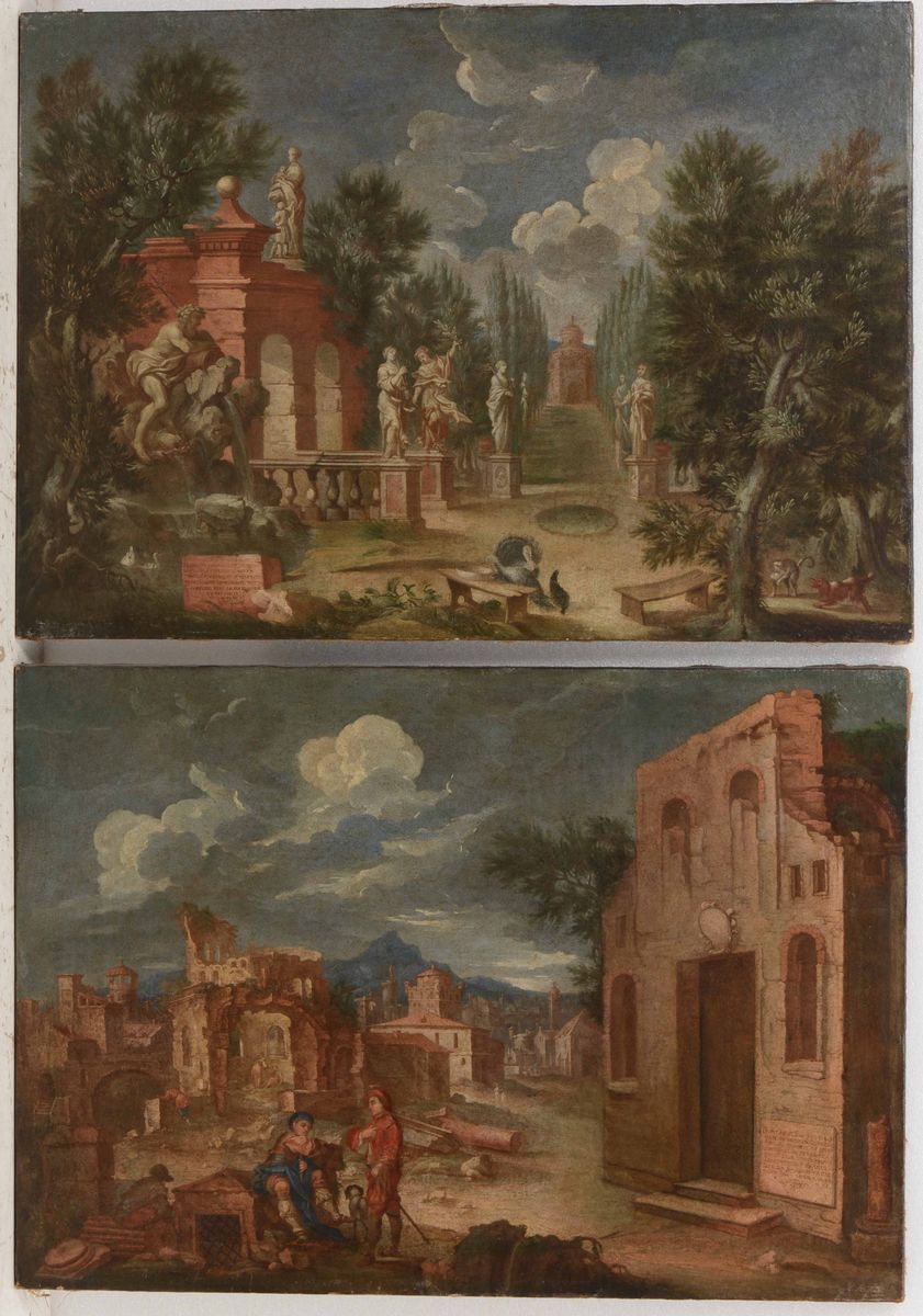 Scuola del XVIII secolo Scenografia con veduta di giardino e Veduta di Roma con rovine