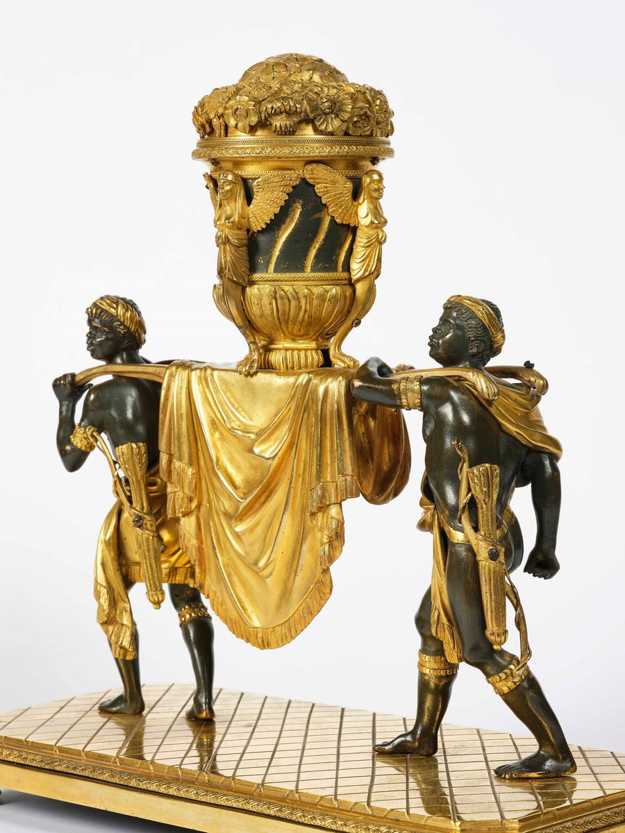Due figure di mori che sorreggono portantina su cui poggia il bruciapofumo contornato da tre figure alate.