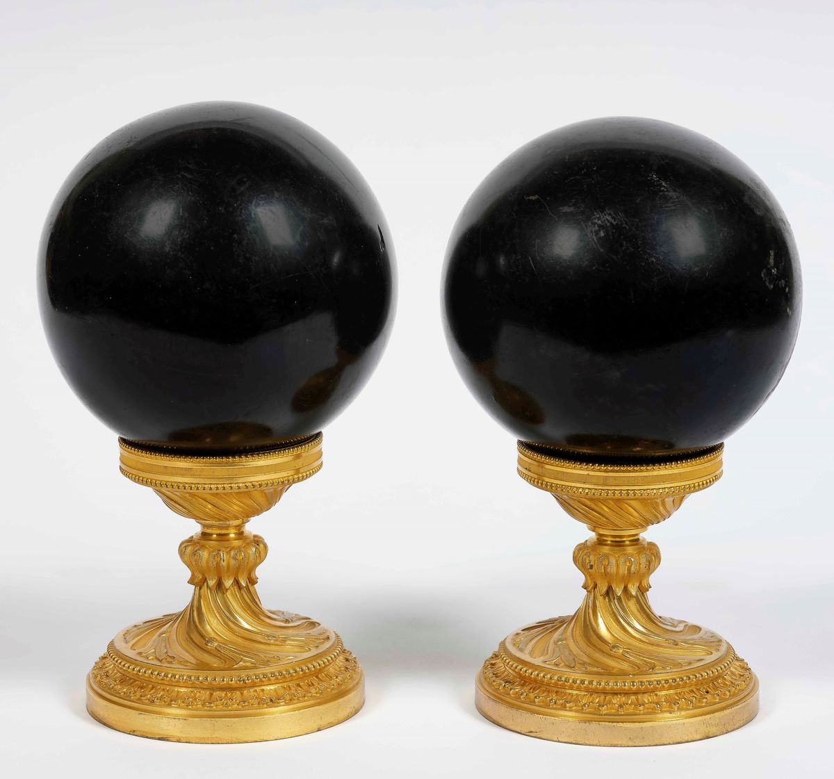 Coppia di basi in bronzo dorato e cesellato a torchon che reggono sfere in marmo