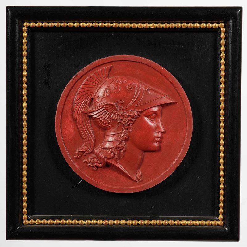 Terracotta (?). Diametro cm 14,5. Cornice in legno, cm 24,5 x 24,5. Conservazione: ottima