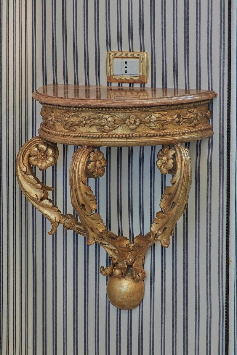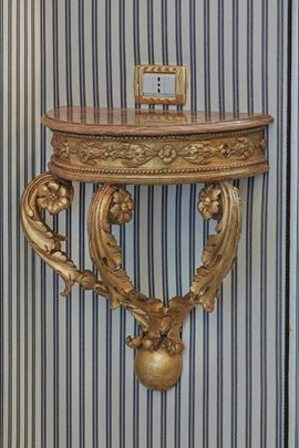 Coppia di piccole consolles pensili a demilune in legno intagliato e dorato. XIX secolo