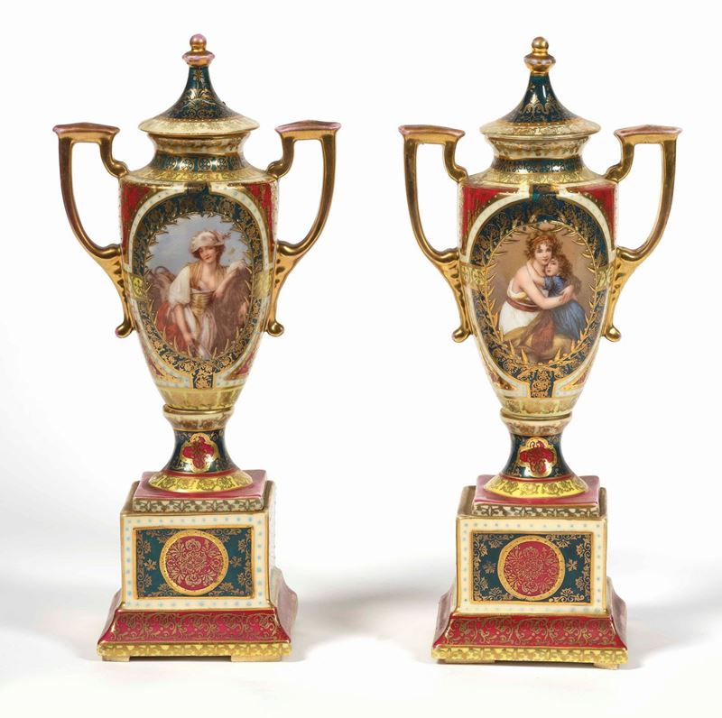 I vasi ad anfora, con coperchio “a pagoda”, hanno anse mistilinee e poggiano su base a plinto dalla sezione quadrata. Sul fondo color rosso ospitano sul recto un’ampia riserva con scena policroma ispirata alle pitture di Angelica Kauffmann, sul verso riserva con motivi in oro. Il resto della superficie é decorata con abbondanti motivi vegetali geometrizzati in oro, in parte a rilievo