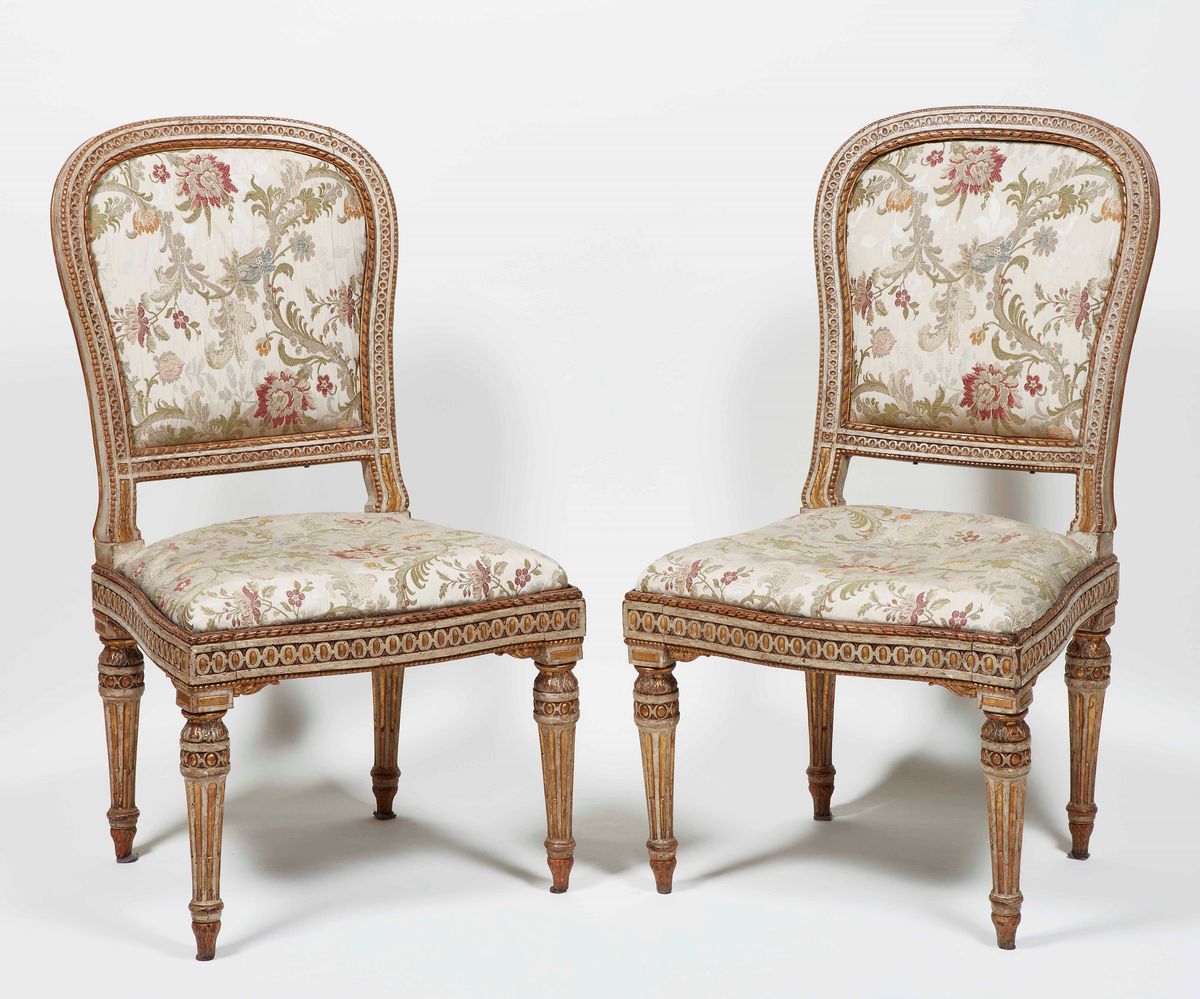 Coppia di sedie in legno intagliato, laccato e dorato. Milano, fine XVIII secolo