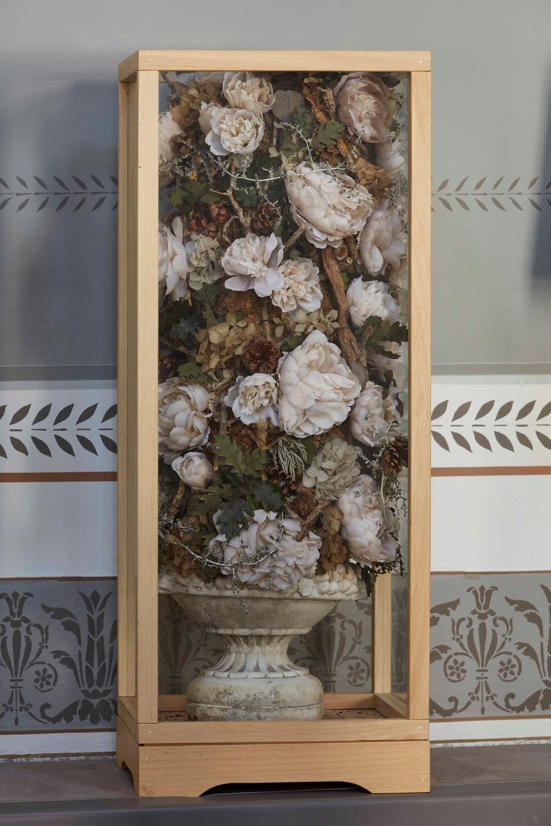 Coppia di teche contenenti composizioni di fiori entro vasi in pietra