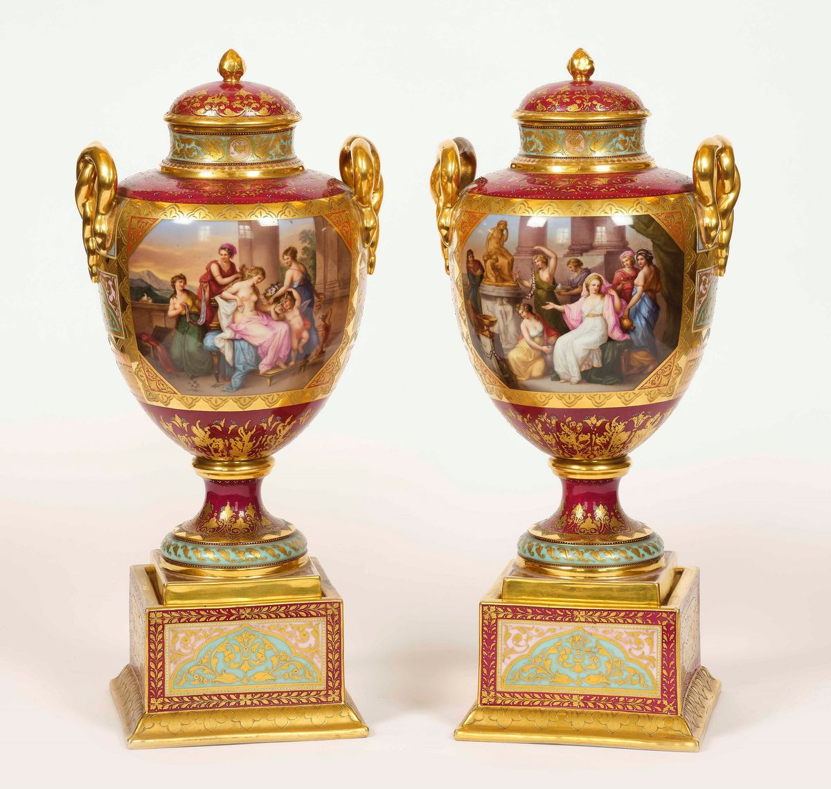 I vasi ad anfora, con coperchi dalla presa a pigna e anse formate da due serpenti che si intrecciano, poggiano su base a plinto dalla sezione quadrata. Su fondo color rosso porpora ospitano, sia sul recto che sul verso, un’ampia riserva con scena d’ispirazione mitologica alla maniera della manifattura Imperiale di Vienna. Le raffinate decorazioni pittoriche sono descritte in tedesco e tracciate in rosso sotto le basi: “Diana” e “Hero und Leander im Tempel”, rispettivamente “Toilette der Venus” e “Bachus und Ariadne”. Il resto della superficie é decorata con abbondanti elementi in oro, anche a rilievo, su campi color turchese e rosa
