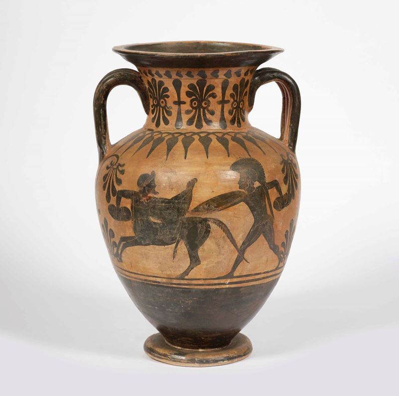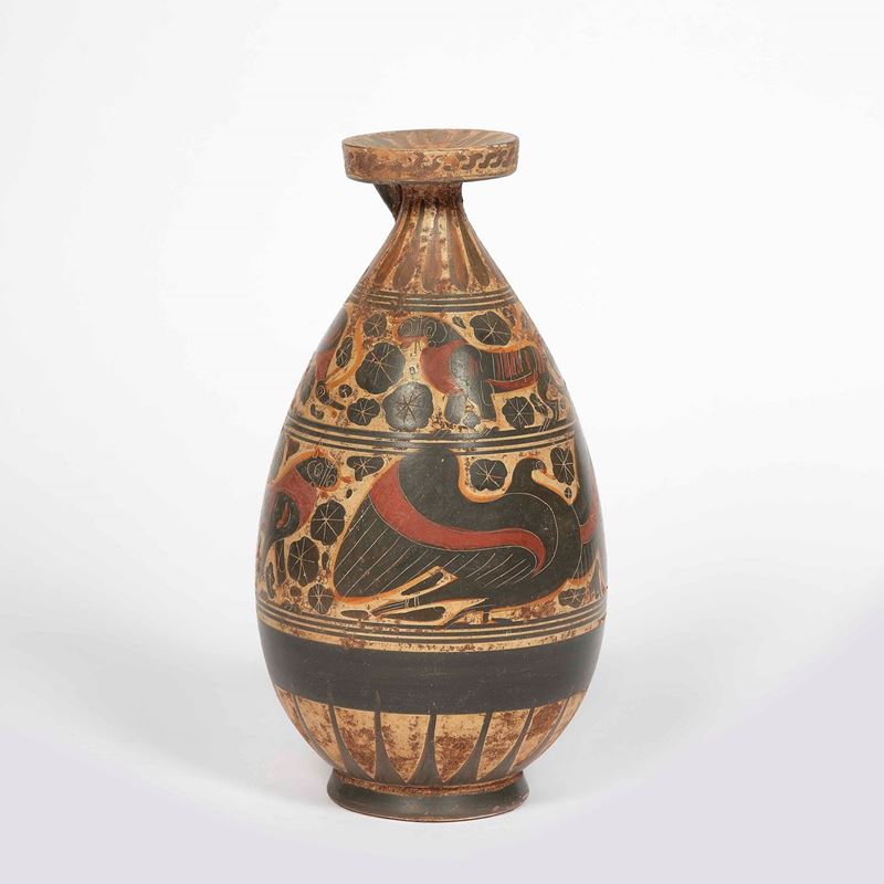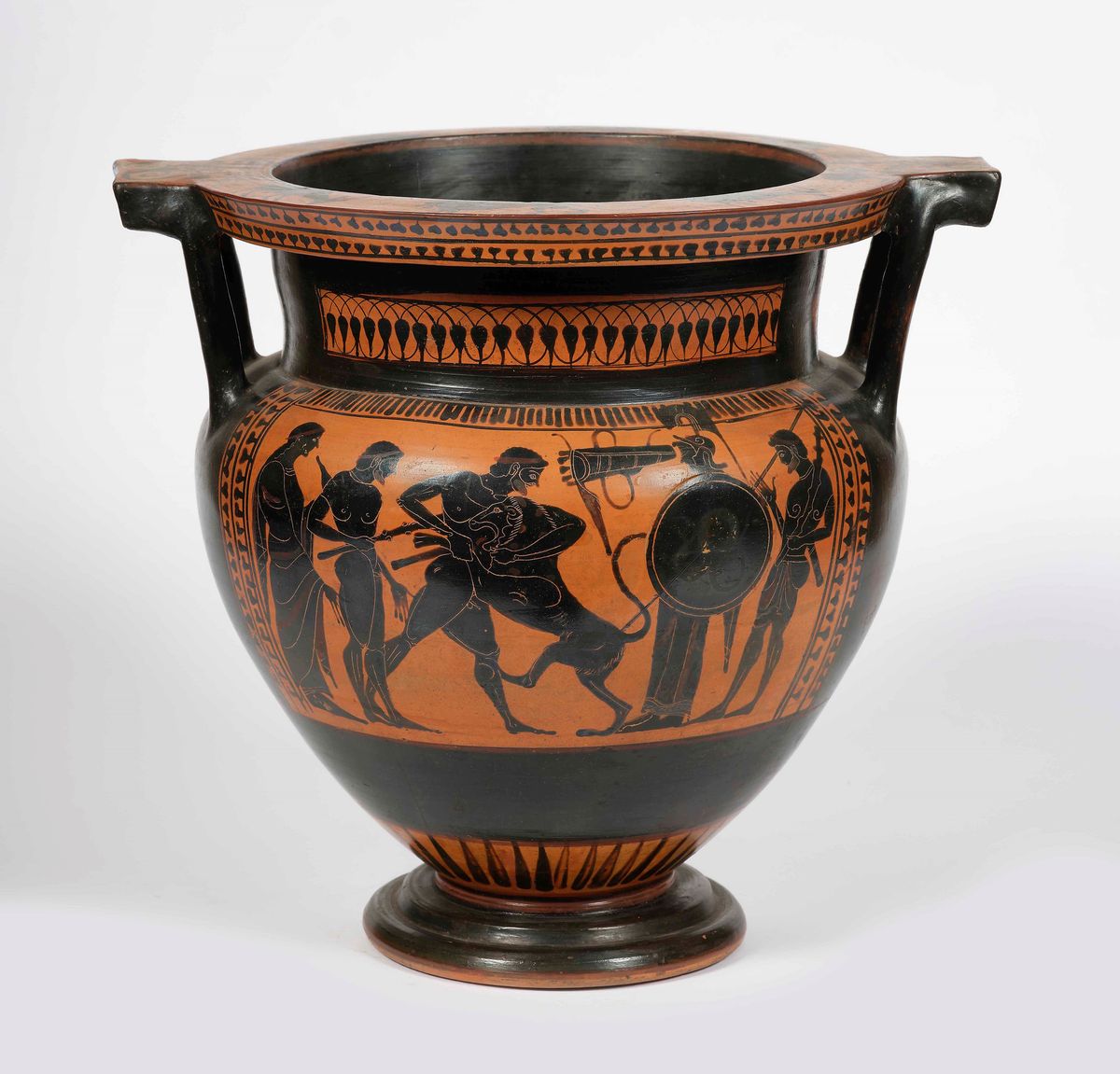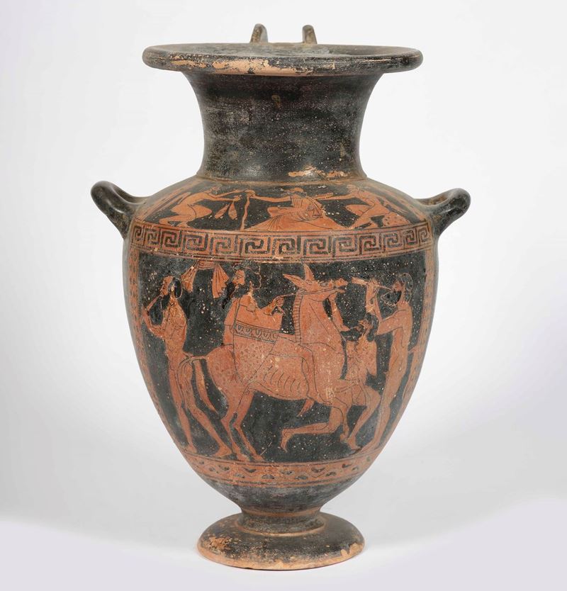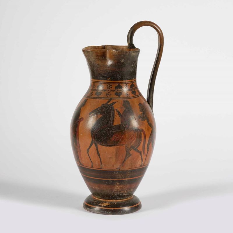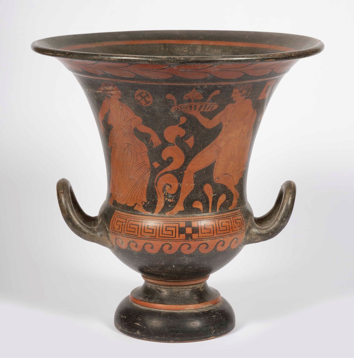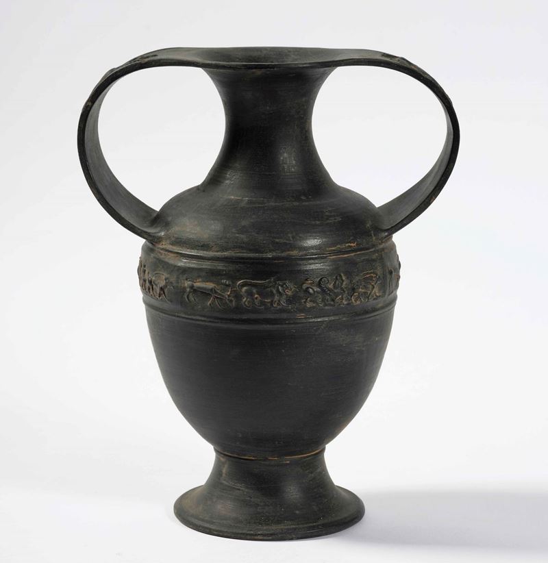 Questi vasi appartengono a una vasta produzione ottocentesca di copie dall’antico delle fabbriche napoletane. In seguito al grande successo dei ritrovamenti di Pompei, Ercolano e Italia meridionale si imita la ceramica archeologica con riproduzioni, ma pure rielaborazioni, di vasi greco-italici, moda questa che ha le sue origini già nel periodo Neoclassico. Eseguiti in terracotta o terraglia opaca presentano figure rosse su fondo nero, figure nere su fondo rosso oppure interamente in terracotta bronzata