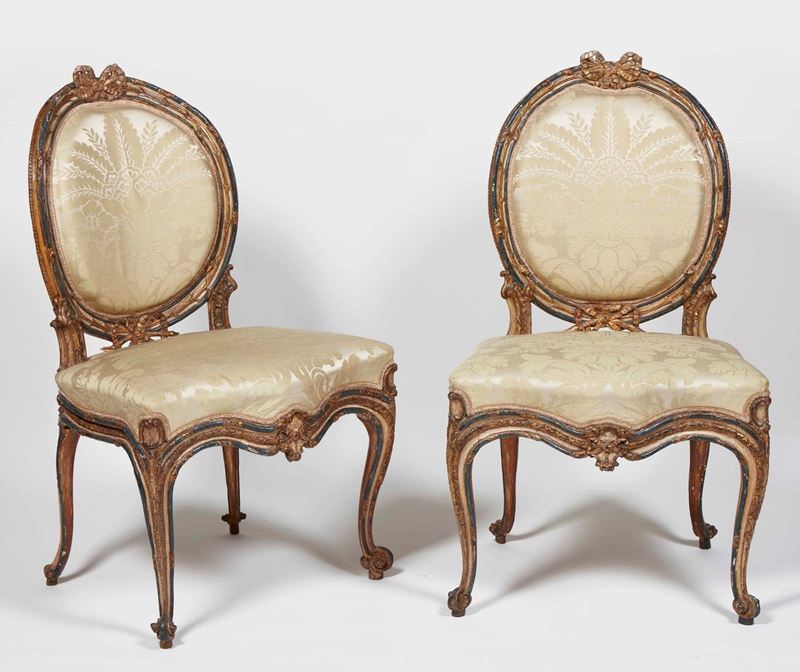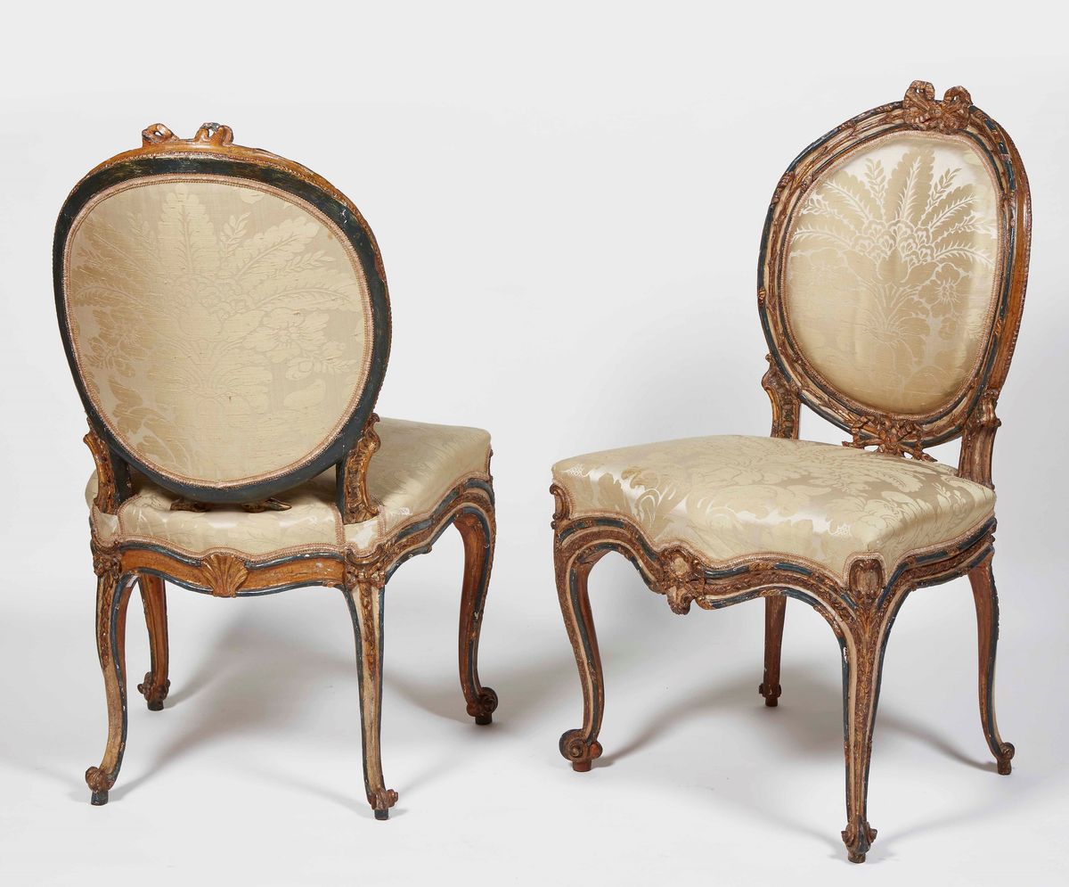 Gruppo di quattro sedie Luigi XV in legno finemente intagliato, decorate in lacca avorio e blu e lumeggiate in oro. Italia meridionale ultimo quarto XVIII secolo