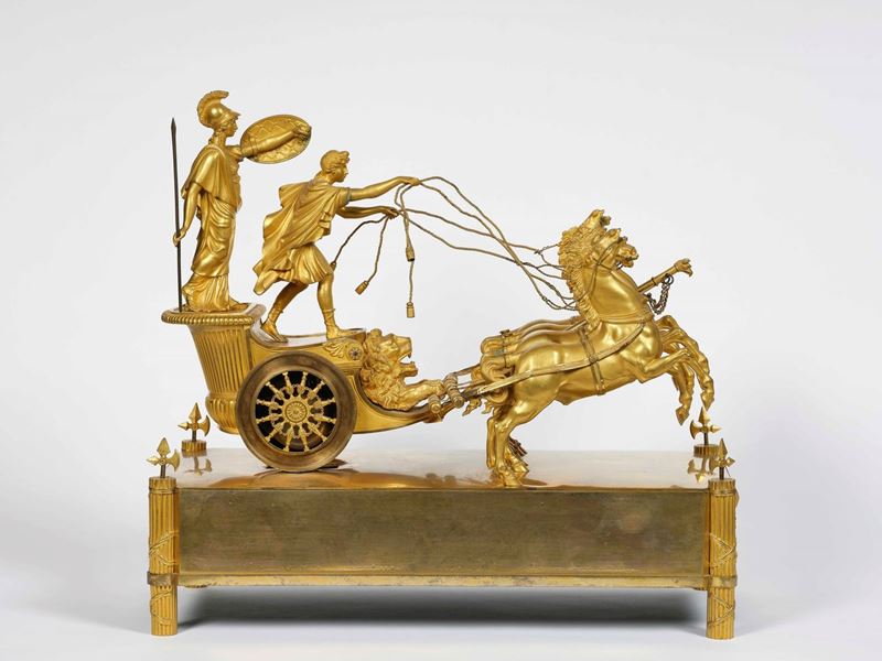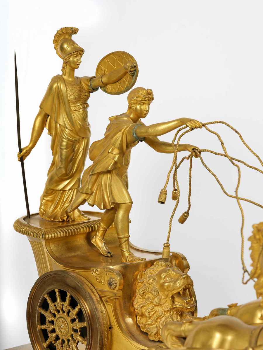Raffigurante Telemaco alla guida di una quadriga sotto protezione di Atena; fascia oraria circolare smaltata a numerazione romana in nero per le ore.