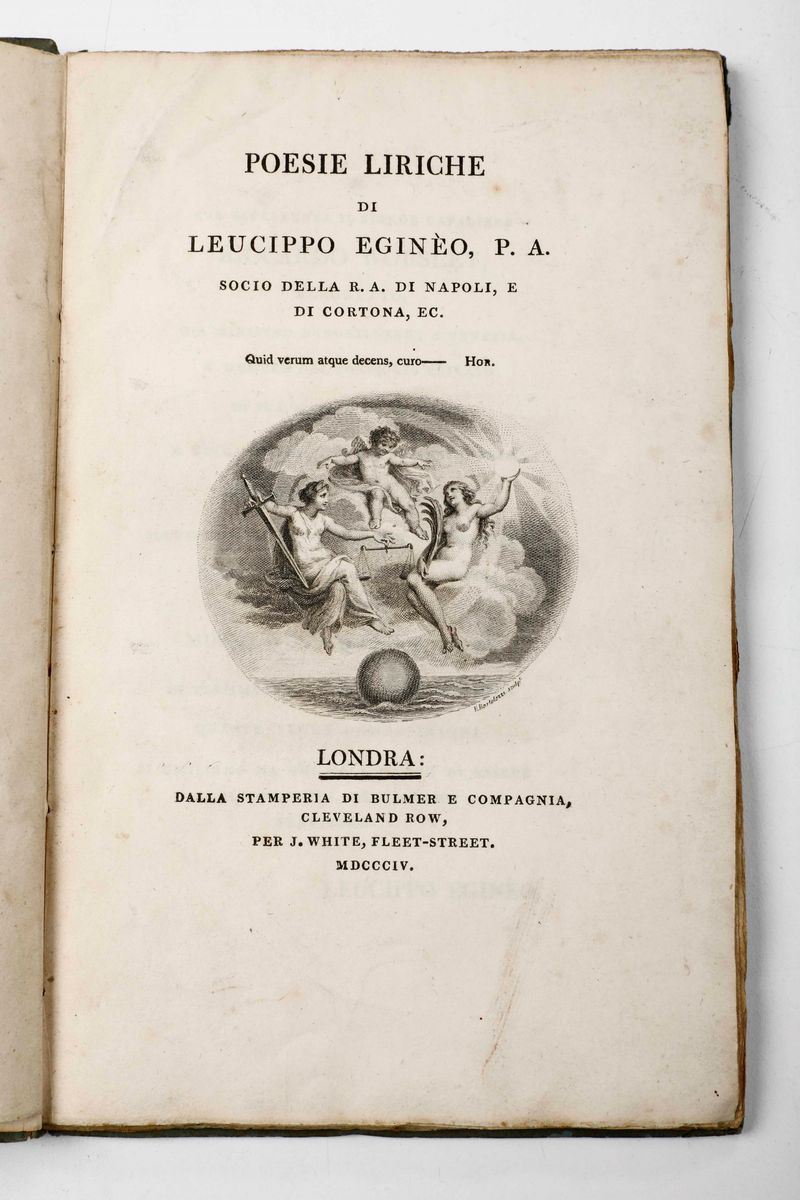 In-16°. Legatura coeva in piena pelle. Si uniscono nel lotto: Poesie liriche di Leucippo Egineo... Londra, Stamperia di Bulmer, 1804. Peregrini Matteo. Il savio di corte. Bologna,Mascheroni,1625 (Legatura staccata. Difetti).