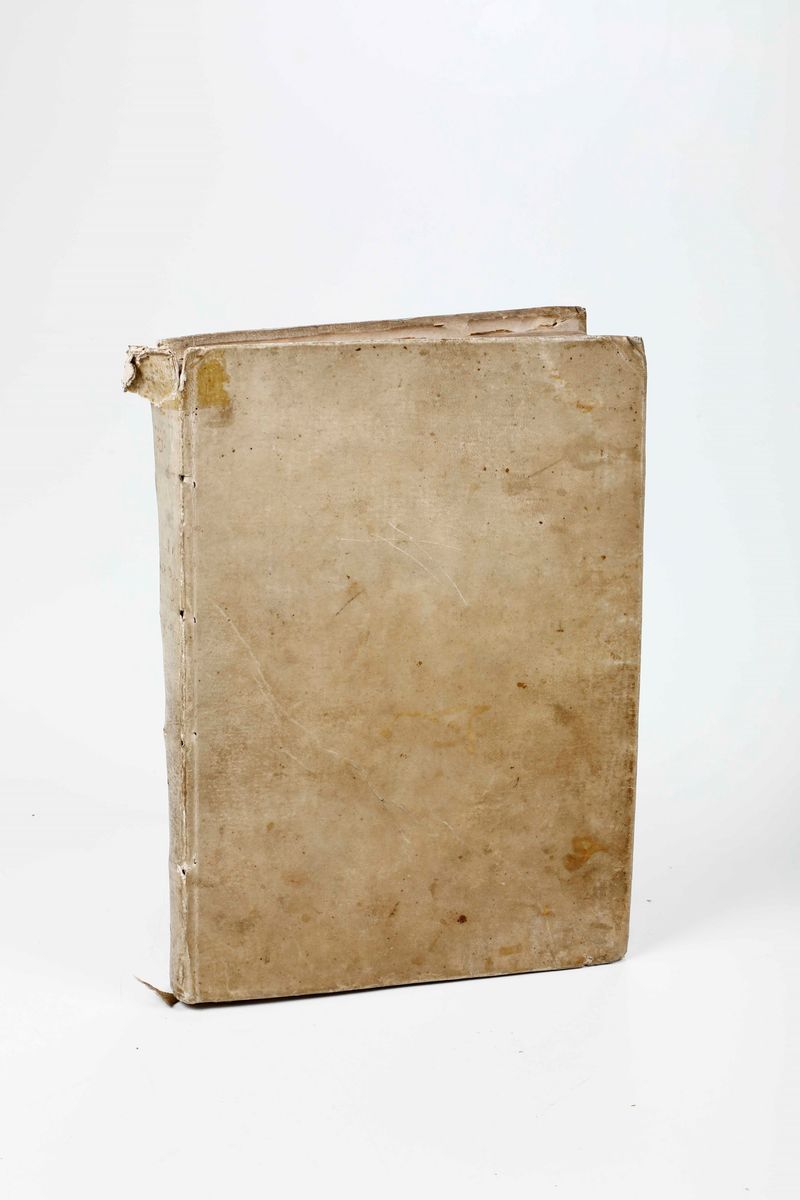 In-4°. Legatura coeva in pergamena rigida staccata. Primo bifoglio sciolto. Ex libris moderno al contropiatto.