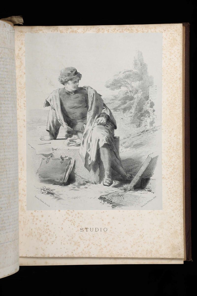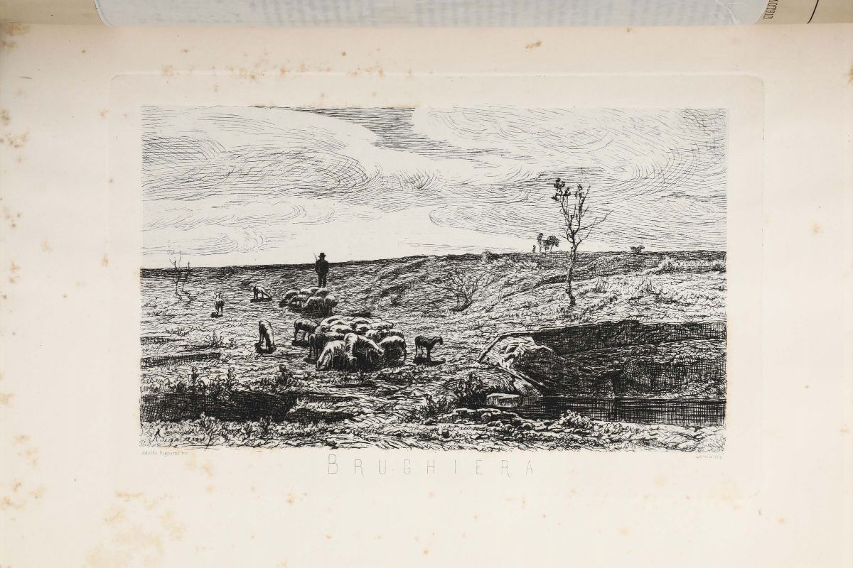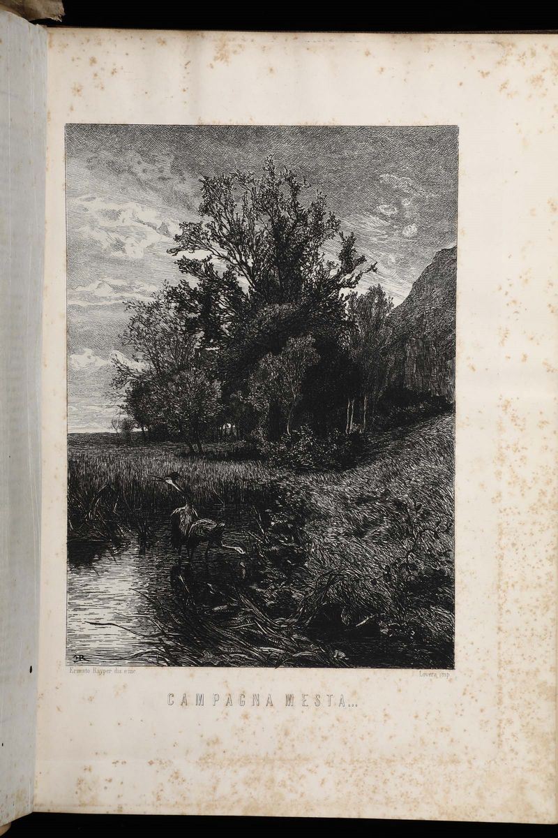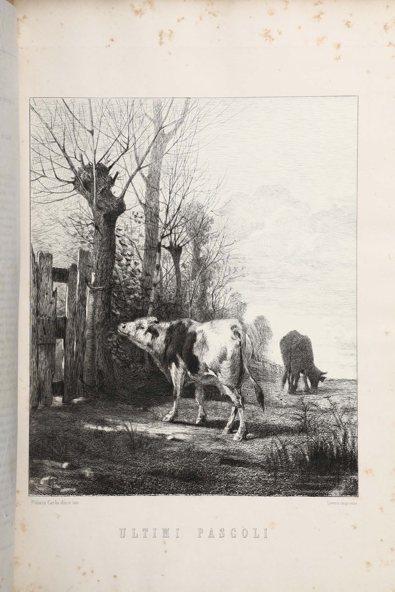 In-folio. Legatura coeva in mezza pelle (abrasione al dorso). Tra le incisioni originali presenti segnaliamo: Campagna Mesta, acquaforte di Enrico Rayper, Un Campo di Grano, sempre dello stesso autore e Ranocchi, acquaforte di Antonio Fontanesi. Il solo volume I di cinque che compongono l'opera completa.