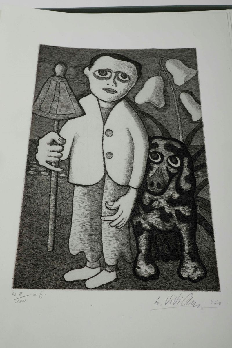 Esemplare appartenente alla tiratura di testa di soli cento esemplari numerati in numeri romani, contenente un'acquaforte originale dell'artista, numerata e firmata