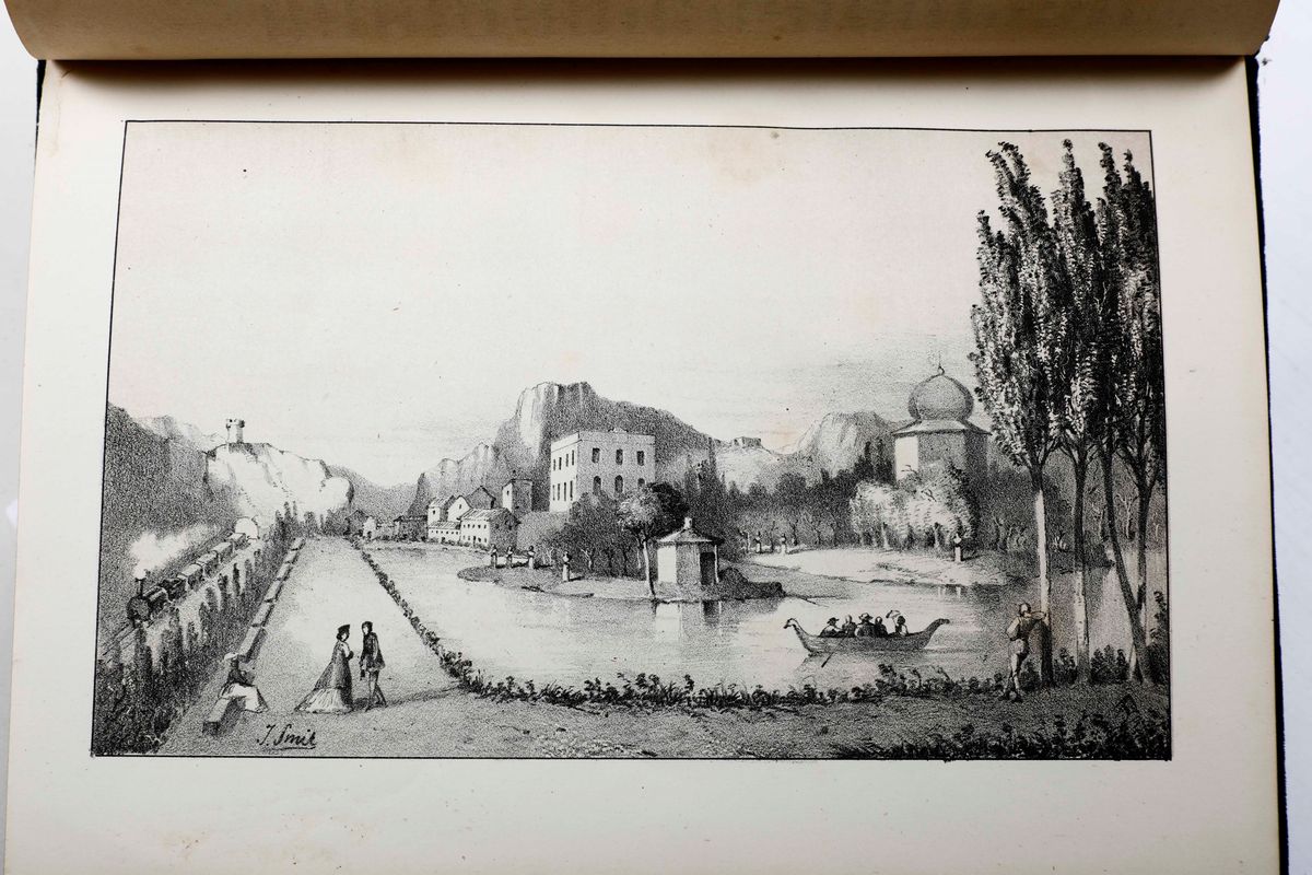 In-8°. Legatura editoriale molto bella, in velluto verde con impressione in oro ai piatti. Graziosa edizione illustrata da 6 tavole litografiche fuori testo, 5 di vedute e una pianta della zona.