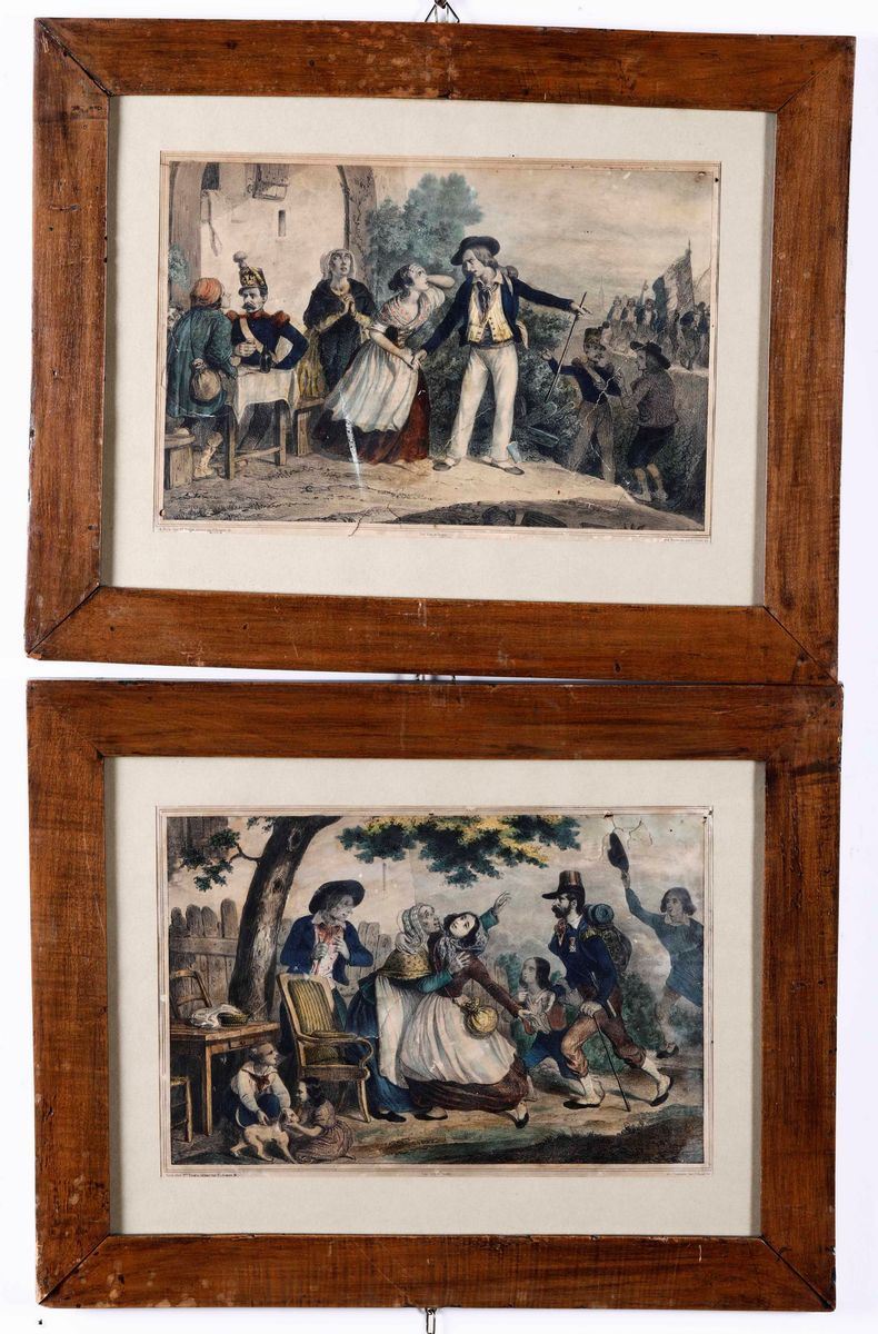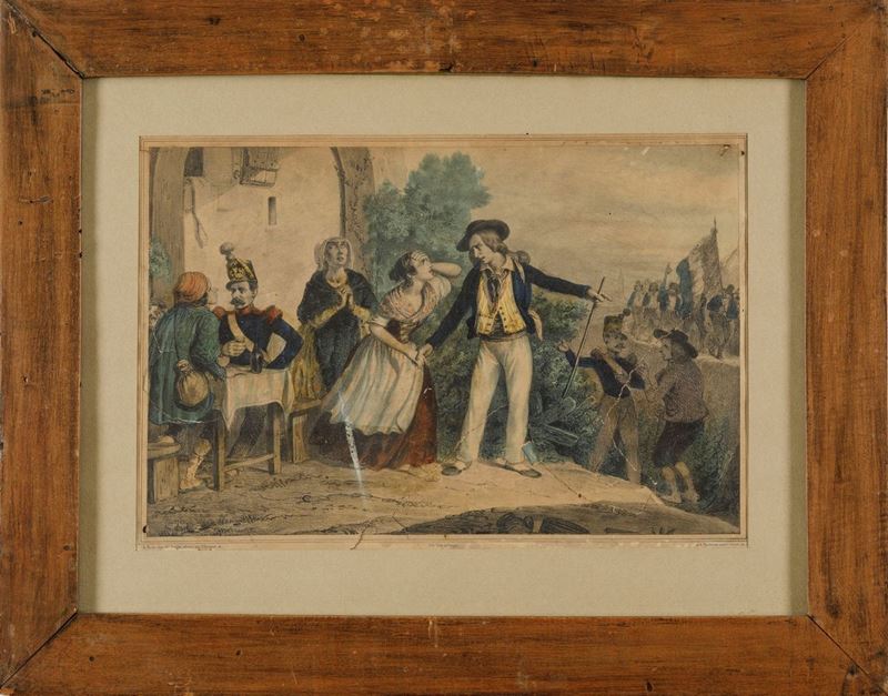 Tre litografie ottocentesche con soggetti popolari in coloritura coeva che presentano strappi e fori di tarlo. cm 21x30.
