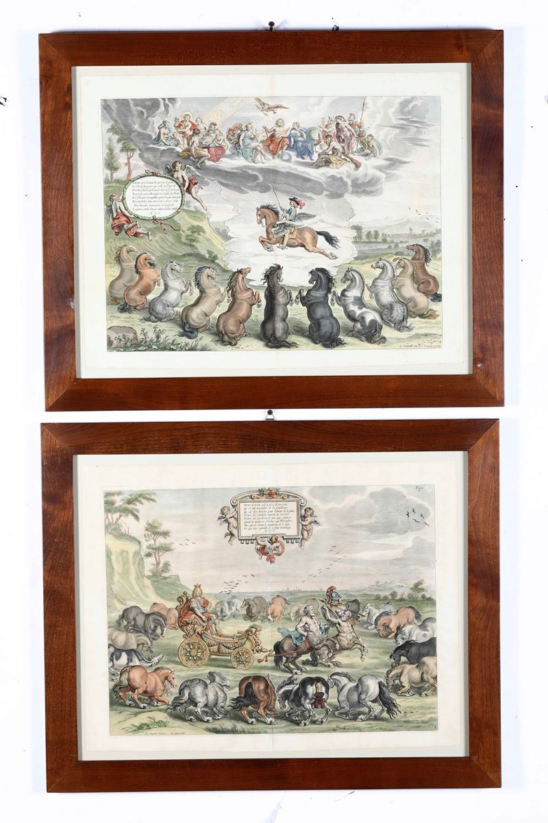 Quattro stampe equestri in cornice, XIX secolo Stampe di soggetto equestre e ludico. Secolo XIX