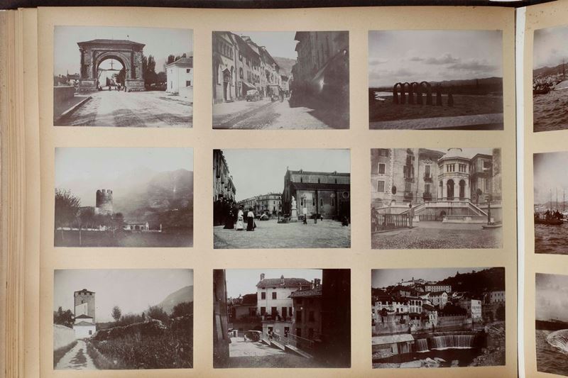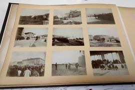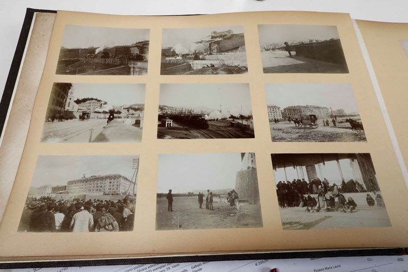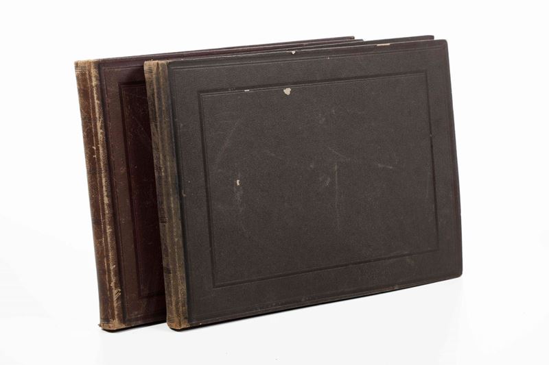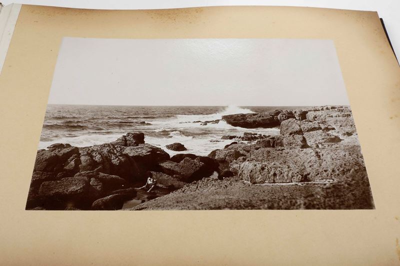Bella raccolta di immagini fotografiche di anonimo autore dilettante. Diversi formati raccolti entro due album in formato oblungo, rilegati in tela percallina. In evidenza un'interessante serie di immagini sulla Tonnara e la lavorazione del tonno (Favignana o altra località della Sicilia e del Sud Italia)