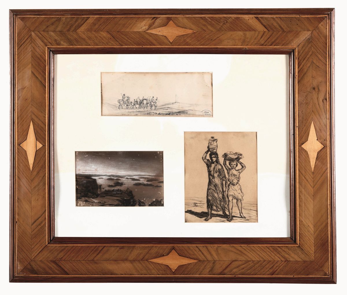 Insieme di cinque disegni entro coppia di cornici in legno lastronato ed intarsiato. XIX-XX secolo
